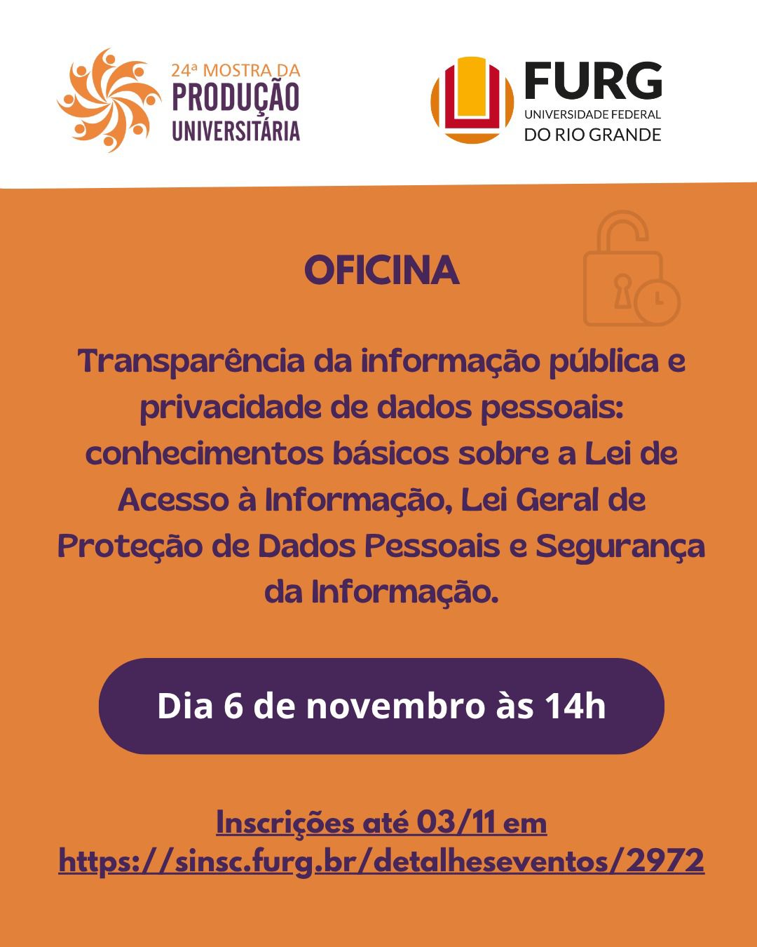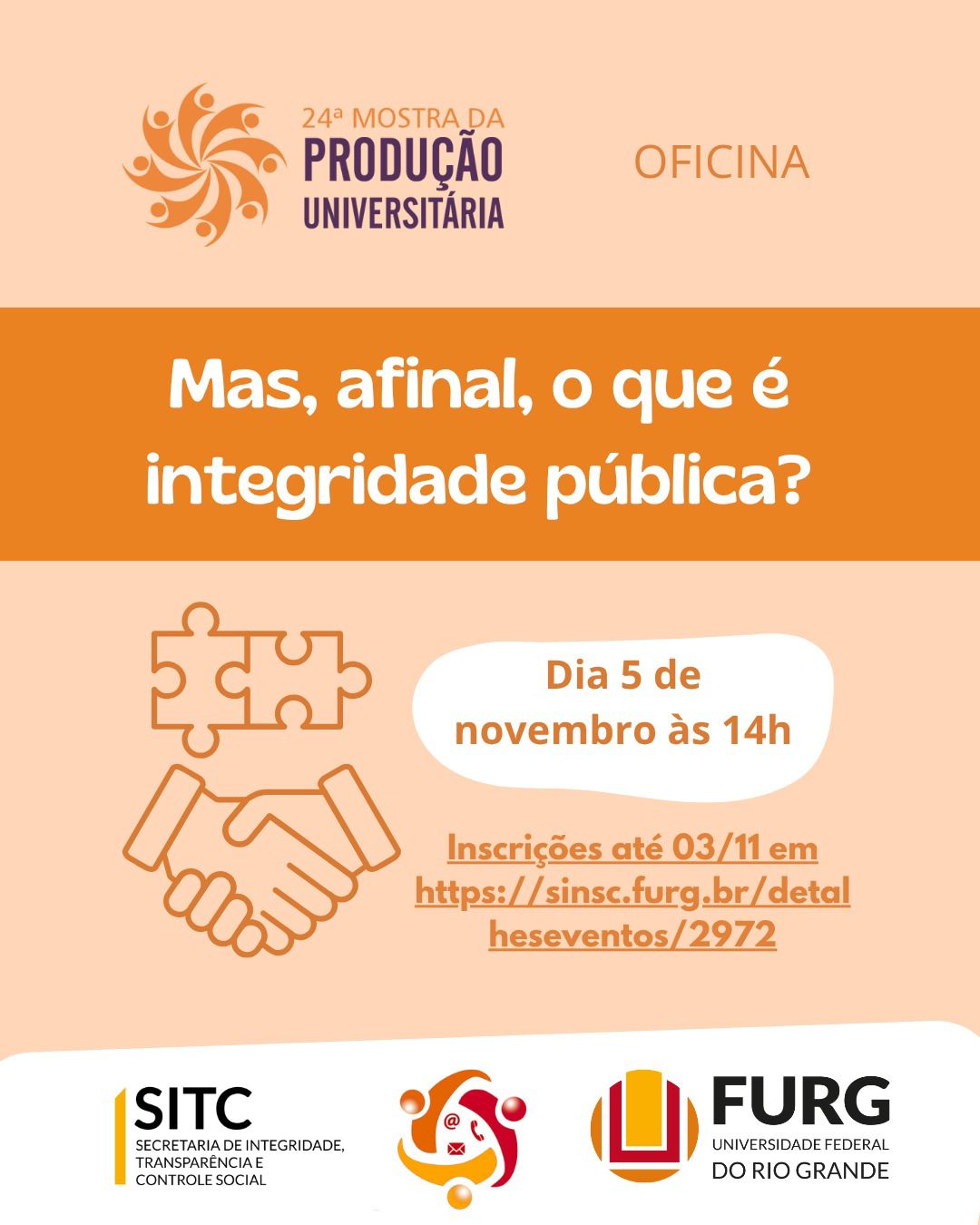 A Secretaria de Integridade, Transparência e Controle Social (Sitc) e a Ouvidoria da Universidade Federal do Rio Grande (FURG) estarão presentes na 24ª Mostra de Produção Universitária (MPU), ministrando três oficinas institucionais. Em função das oficinas, no período da tarde dos dias 5 e 6 e manhã do dia 7, não haverá atendimento presencial. A comunidade pode entrar em contato pelos canais ouvidoria@furg.br, sitc@furg.br, (53) 3293-5450 (WhatsApp) ou diretamente na Plataforma Fala.BR.