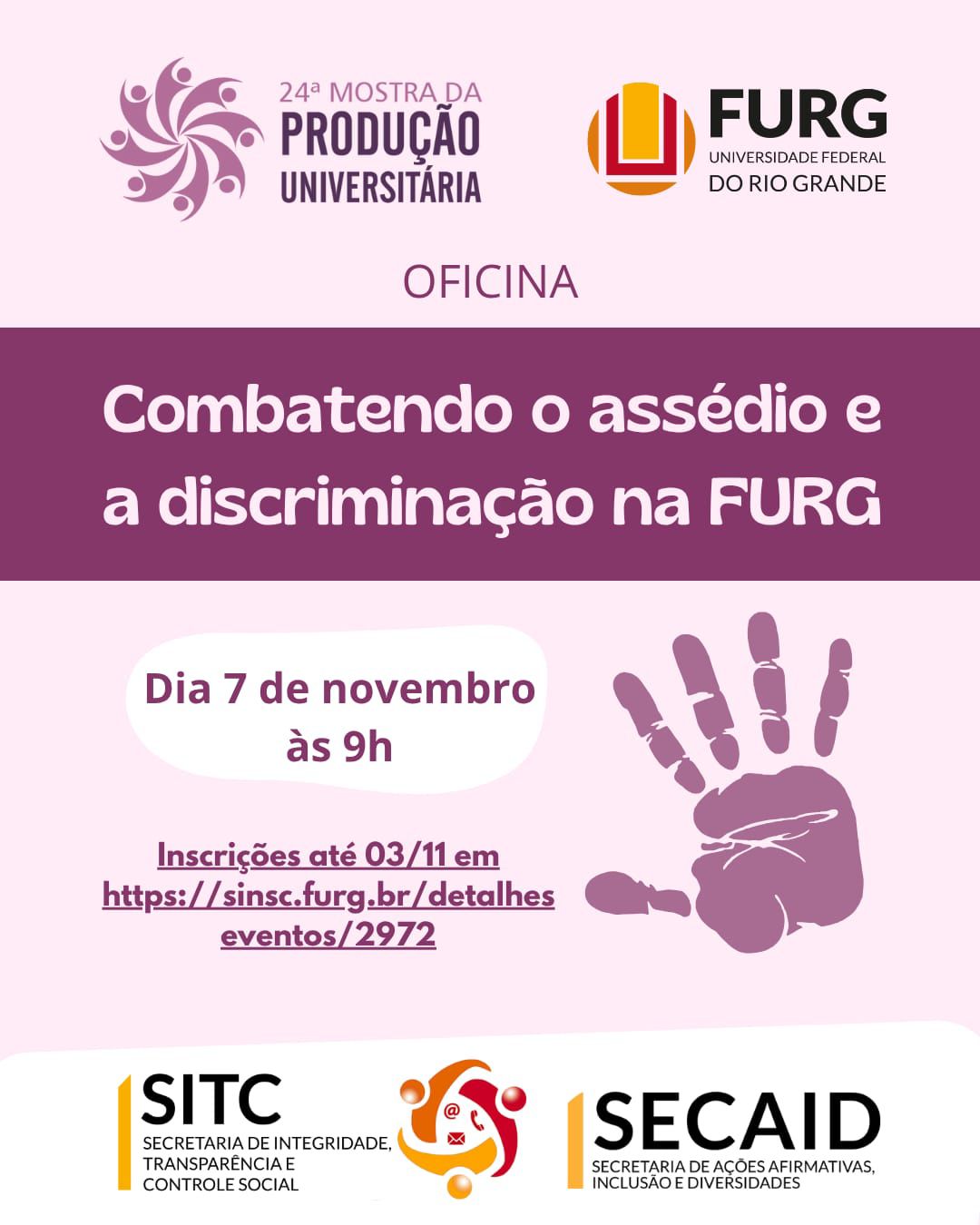 - "Combatendo o assédio e a discriminação na FURG", dia 7, às 9h, em parceria com a Secretaria de Ações Afirmativas, Inclusão e Diversidades (Secaid).