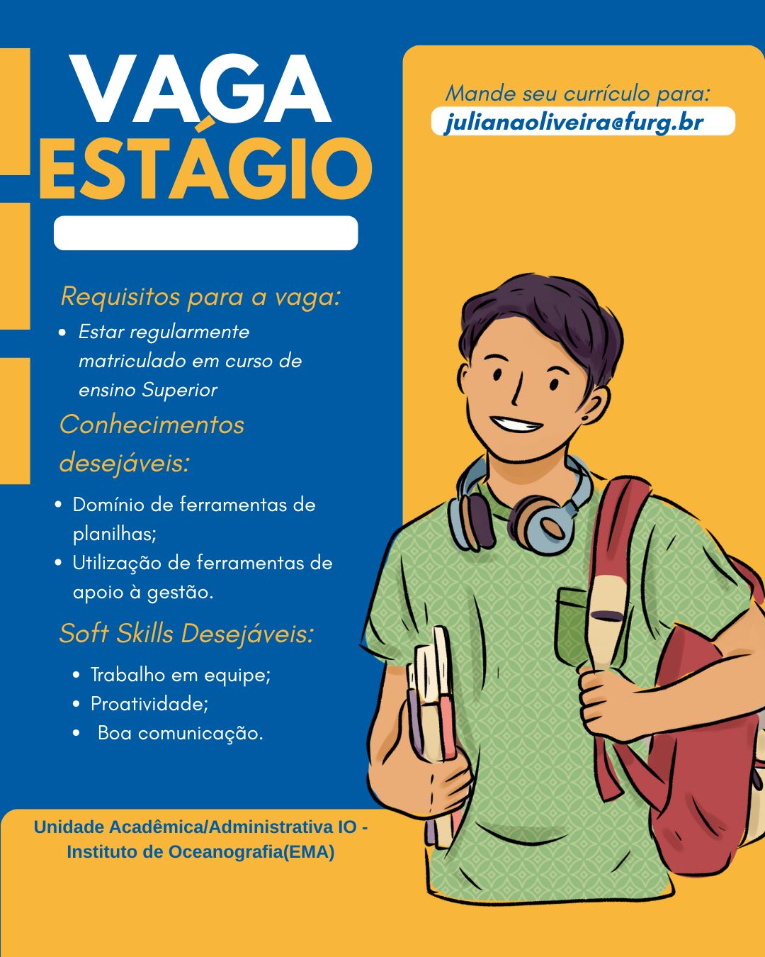 A Estação Marinha de Aquacultura do Instituto de Oceanografia da Universidade Federal do Rio Grande (EMA/IO/FURG) está com inscrições abertas para vaga de estágio não obrigatório, voltada a estudantes de graduação. Interessados podem enviar currículo para julianaolveira@furg.br. Mais informações e requisitos no cartaz abaixo.