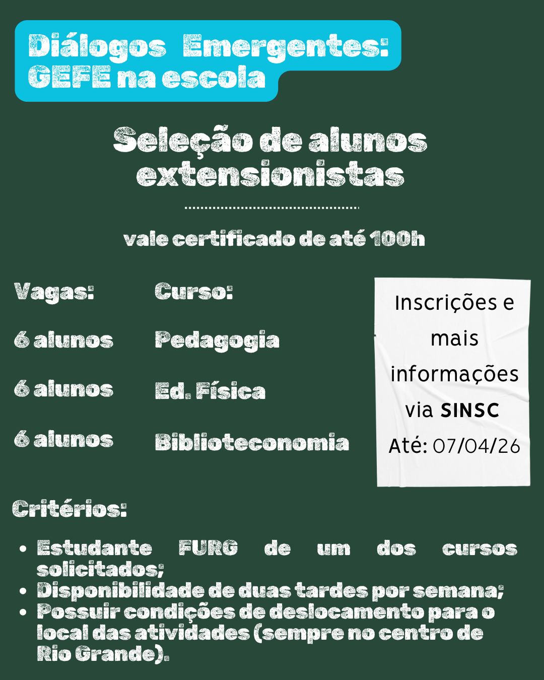 O projeto de extensão "Diálogos Emergentes: Gefe na escola" promove a seleção de discentes da Universidade Federal do Rio Grande (FURG) para compor sua equipe fixa de extensionistas voluntários. O grupo atuará em atividades com jovens vinculados ao Cento de Convívio dos Jovens do Mar (CCMar), as quais serão elaboradas coletivamente a partir de formações prévias.