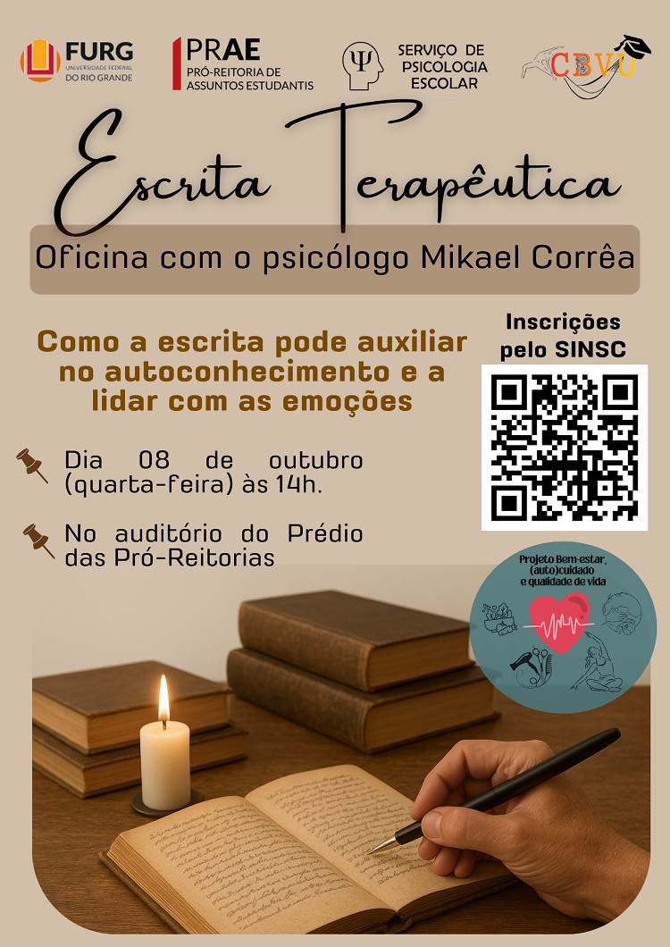 Na próxima quarta-feira, 8, às 14h, no auditório do prédio das Pró-Reitorias (Campus Carreiros), acontece a oficina Escrita Terapêutica com o psicólogo Mikael Corrêa. A oficina contemplará a compreensão de como a escrita pode auxiliar no autoconhecimento e a lidar com as emoções, além de estratégias para desenvolver a escrita como recurso rotineiro de promoção de saúde mental. O evento tem como público-alvo estudantes de graduação e pós-graduação. As inscrições devem ser feitas através do Sinsc.