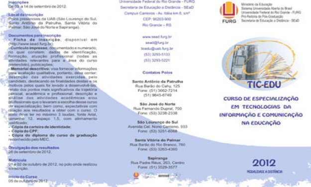 A Secretaria Geral de Educação a Distância (SEaD/FURG) anuncia a abertura de inscrições para a seleção de Tutor Bolsista Presencial para atuar nos Polos de Sapiranga e São José do Norte junto ao Curso de Especialização em Tecnologias da Informação e Comunicação na Educação, no âmbito do Sistema Universidade Aberta do Brasil. Também informa o processo de seleção para o Curso de Especialização em Tecnologias da Informação e Comunicação na Educação, na modalidade a distância. Os editais e fichas de inscrição podem ser acessados pelos seguintes sites: