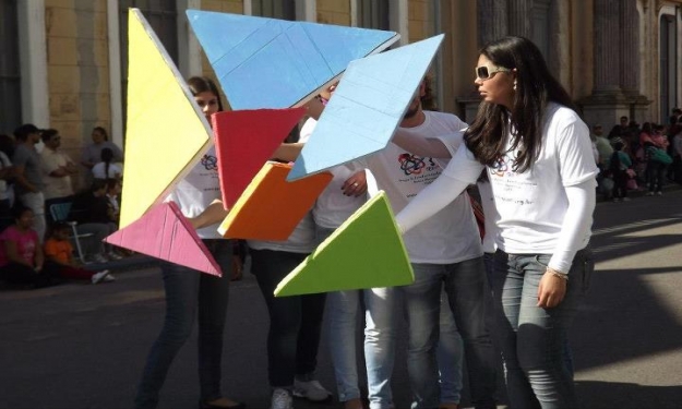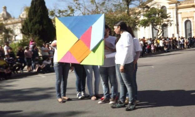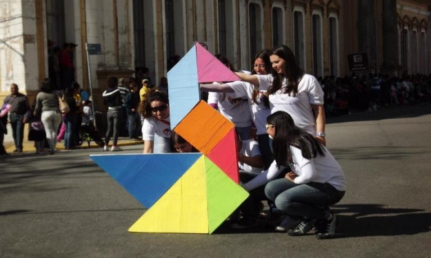 Durante o desfile, os integrantes do projeto construíram diversas figuras por meio da manipulação das sete peças de um Tangram gigante confeccionado pelo grupo. O Tangram é um quebra cabeça chinês de origem milenar muito utilizado pelo grupo pela facilidade na construção e na multiplicidade de exploração das relações da Arte e da Matemática.