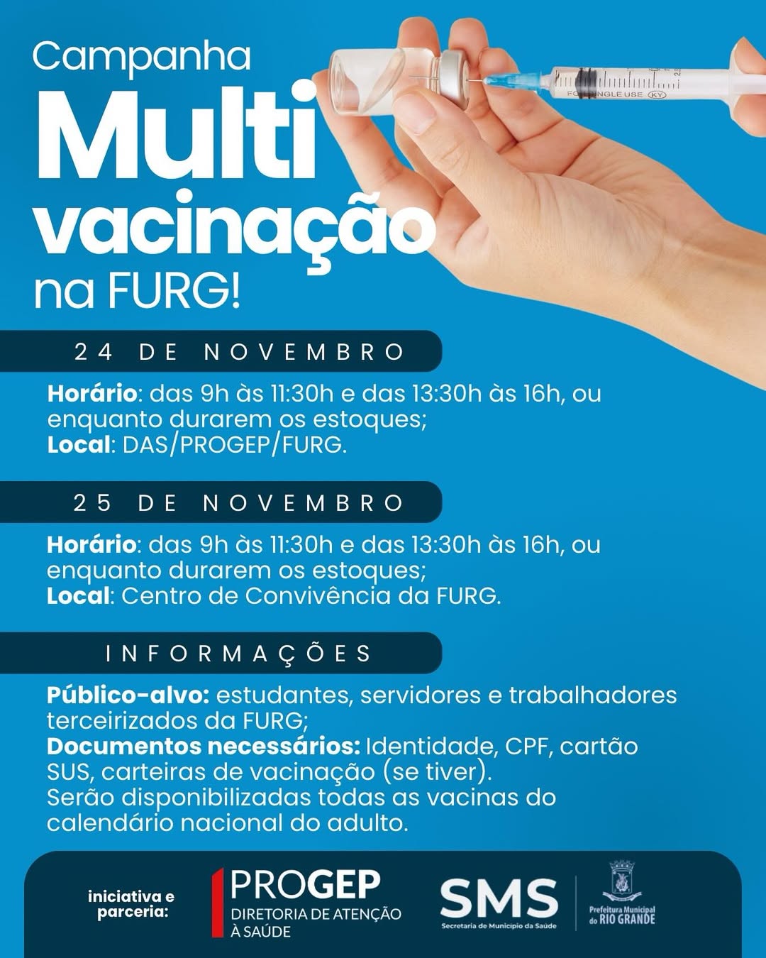 A Diretoria de Atenção à Saúde da Pró-reitoria de Gestão de Pessoas da Universidade Federal do Rio Grande (DAS/Progep/FURG) divulga Campanha de Multivacinação, com aplicação de todas as vacinas do calendário nacional do adulto. A ação é voltada a estudantes, servidores e trabalhadores terceirizados da FURG.