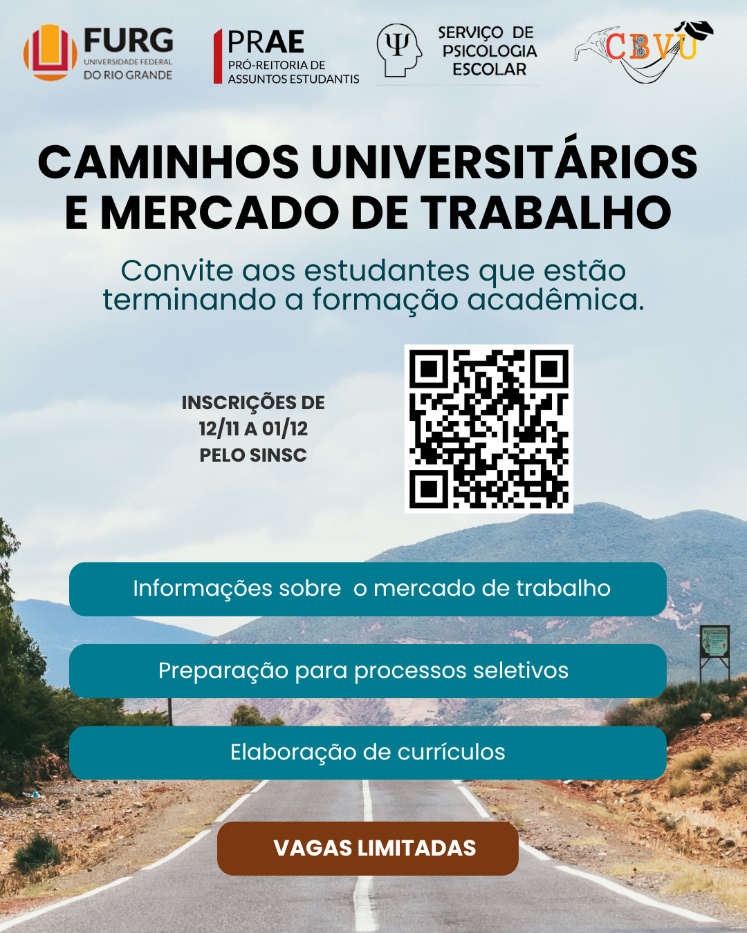 A Pró-Reitoria de Assuntos Estudantis da Universidade Federal do Rio Grande (Prae/FURG), por meio do Serviço de Psicologia Escolar, promove a Oficina Caminhos Universitários e Mercado de Trabalho. Será no dia 2 de dezembro, das 13h30m às 15h, no auditório do Prédio das Pró-Reitorias. A atividade é uma releitura do grupo, de mesmo nome, ofertado em 2022.