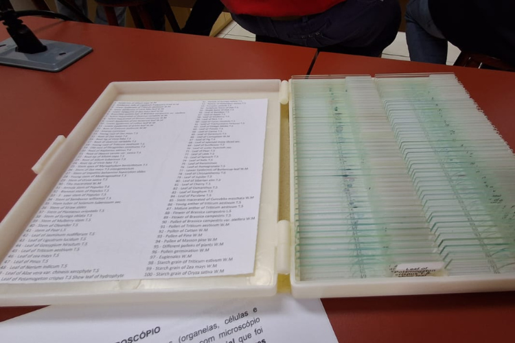 Durante as atividades, os estudantes tiveram contato com o funcionamento do microscópio ótico e estereoscópico (lupa) e observaram materiais vegetais.