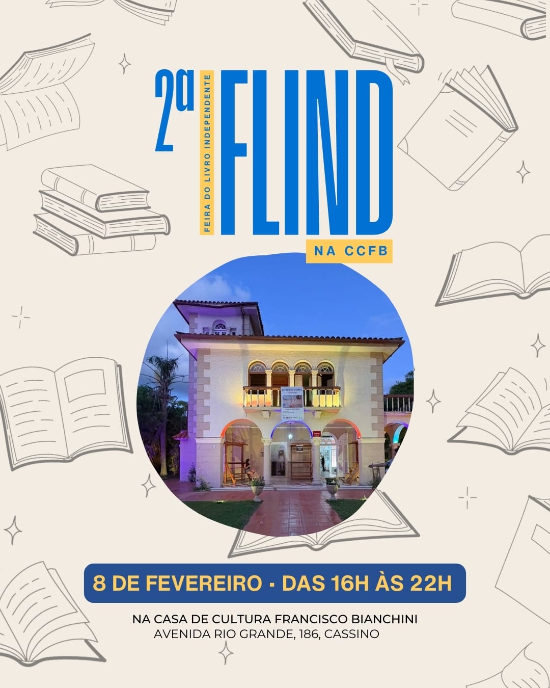 Com o tema “Leia Rio Grande”, acontece no próximo domingo (8), das 16h às 22h, a segunda edição da Feira do Livro Independente (Flind), na Casa de Cultura Francisco Bianchini (Av. Rio Grande, 186, no Cassino). Venda e empréstimo de livros, sessões de autógrafos, exposições de projetos literários, música, gastronomia, artesanato, entre outras atividades artísticas e culturais estão na programação.