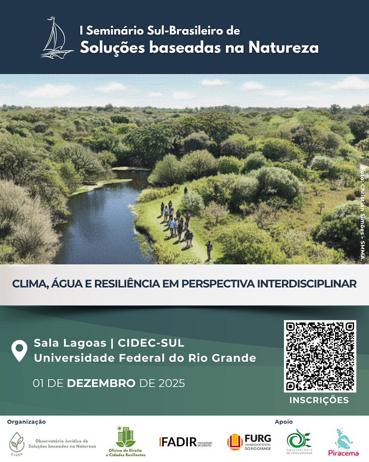 O 1º Seminário Sul-Brasileiro de Soluções baseadas na Natureza, organizado pelo Observatório Jurídico de Soluções baseadas na Natureza (Fadir/FURG) será realizado no próximo dia 1º dezembro, das 14h às 18h, na Sala Lagoas do Cidec-Sul (Campus Carreiros). O evento conta com o apoio do Observatório de Justiça Ecológica (UFSC) e do Instituto Piracema, e tem como objetivo reunir pesquisadores de diferentes áreas do conhecimento para discutir Soluções baseadas na Natureza sob a perspectiva do clima, da água e da resiliência. O evento contará com palestrantes externos, como a professora Letícia Albuquerque (UFSC) e a professora Fernanda Medeiros (Instituto Piracema). As inscrições podem ser feitas acessando o QRCode abaixo.