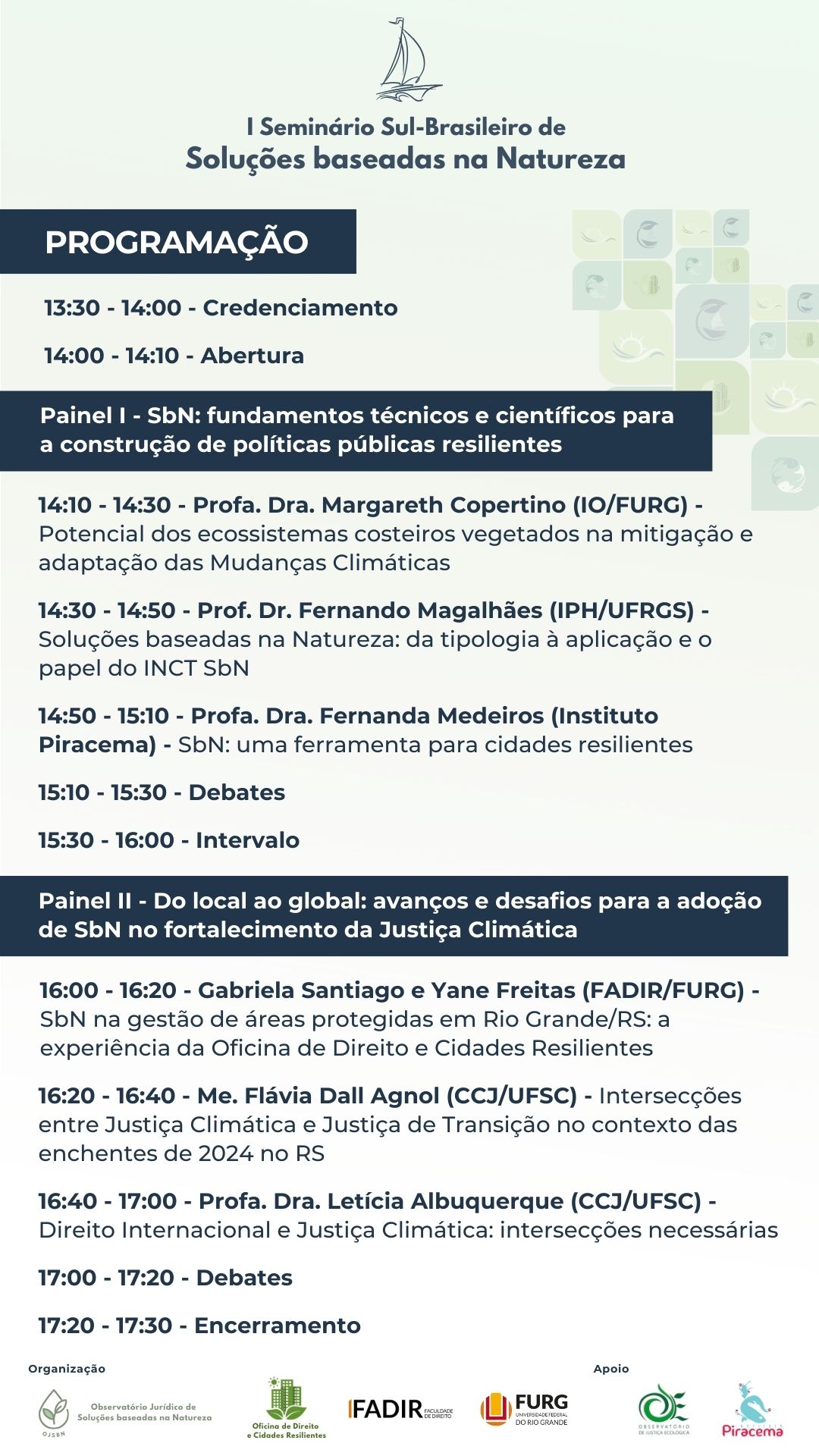 Organizado pelo Observatório Jurídico de Soluções baseadas na Natureza, da Faculdade de Direito da Universidade Federal do Rio Grande (Fadir/FURG), o seminário conta com o apoio do Observatório de Justiça Ecológica (UFSC) e do Instituto Piracema, e tem como objetivo reunir pesquisadores de diferentes áreas do conhecimento para discutir Soluções baseadas na Natureza sob a perspectiva do clima, da água e da resiliência.