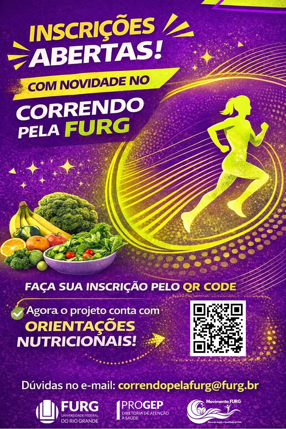 As inscrições devem ser realizadas pelo sistema Sinsc. Dúvidas ou mais informações podem ser encaminhadas para o e-mail: correndopelafurg@furg.br.