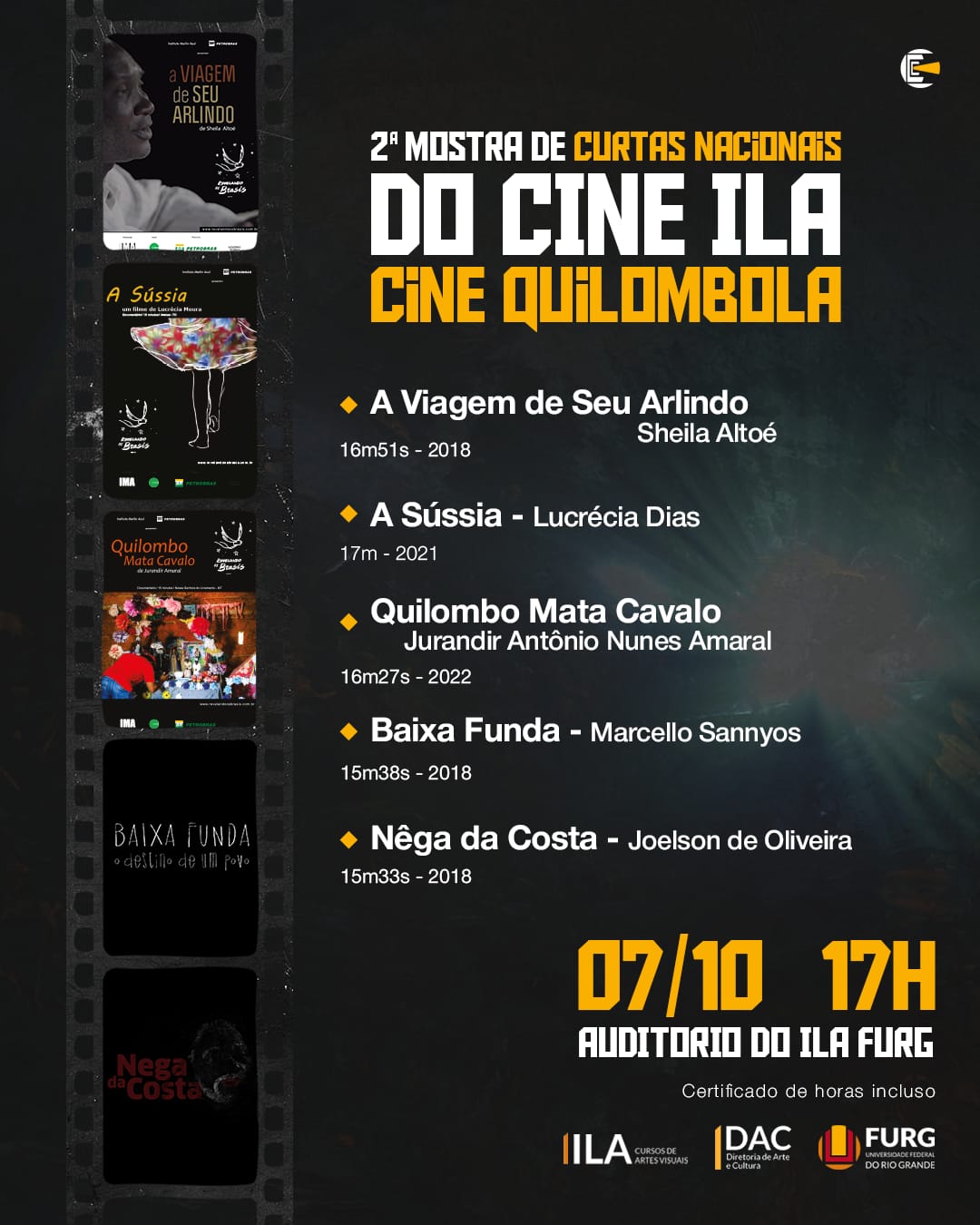 O curso de Artes Visuais da Universidade Federal do Rio Grande (FURG) convida a comunidade acadêmica e em geral para a Mostra Cine Quilombola, tema da segunda edição do projeto de extensão e cultura Cine ILA. Será nesta terça-feira, 7, às 17h, com exibição de cinco curtas que participaram da 6ª Mostra Cinema dos Quilombos, realizada em abril deste ano, em Belo Horizonte. A atividade tem como local o auditório do Instituto de Letras e Artes, no campus Carreiros.
