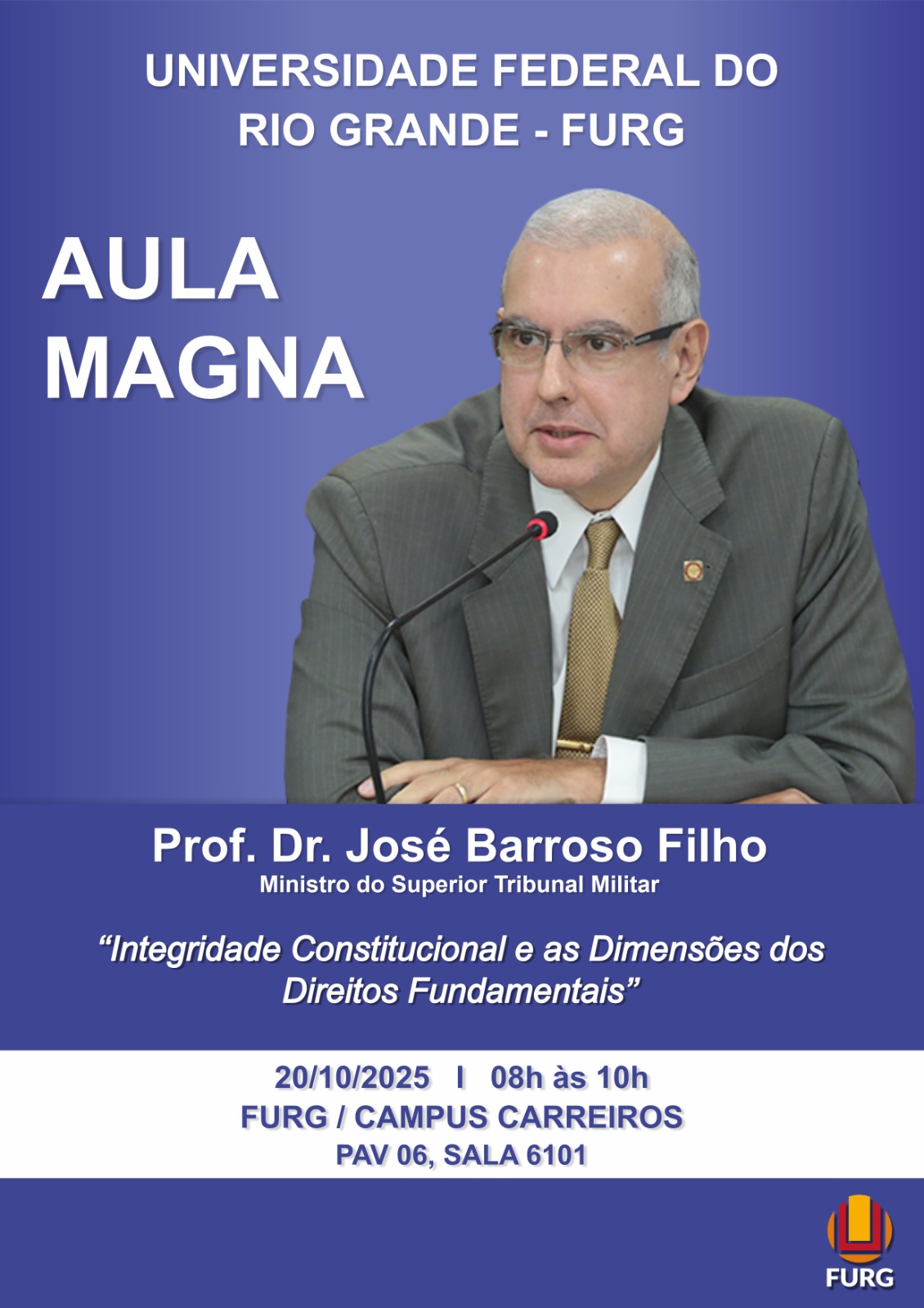 O curso de Direito da Faculdade de Direito da Universidade Federal do Rio Grande (Fadir/FURG) convida para aula magna com o Ministro do Superior Tribunal Militar, prof. dr. José Barroso Filho. Será no dia 20 de outubro, das 8h às 10h, na sala 6101, do Pavilhão 6 do campus Carreiros.