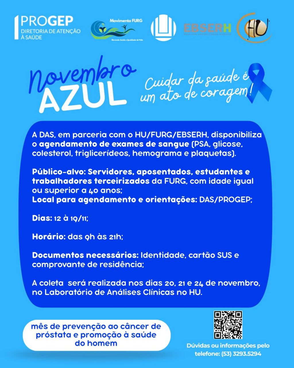 Estão sendo disponibilizados exames de sangue (PSA, glicose, colesterol, triglicerídeos, hemograma e plaquetas). O agendamento e orientações ocorrem na DAS/Progep, Campus Carreiros, de 12 a 19 de novembro, das 9h às 21h. São necessários os seguintes documentos: Identidade, cartão SUS e comprovante de residência.