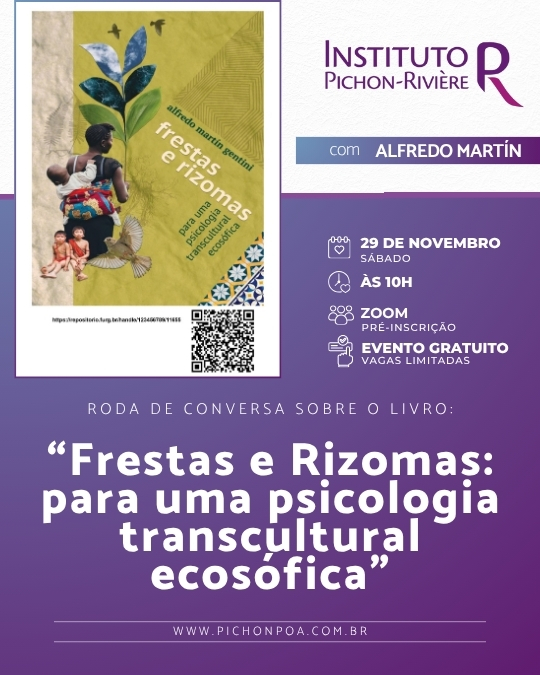 A Editora da FURG (Edgraf) convida para a roda de conversa online "Frestas e Rizomas: para uma psicologia transcultural ecosófica", com o prof. dr. Alfredo Guillermo Martín Gentini. Será no dia 29 de novembro, às 10h, pela plataforma Zoom. A atividade é promovida pelo Instituto de Psicologia Social de Porto Alegre - Pichon-Rivière.
