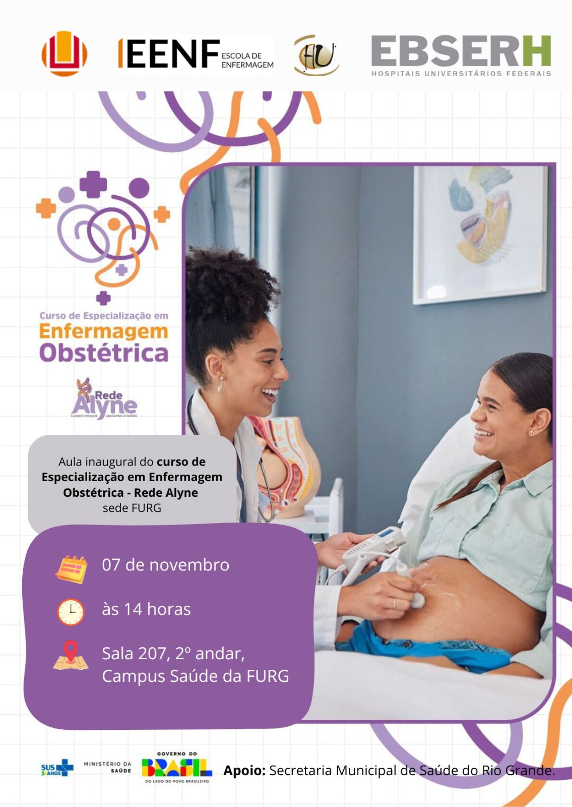 O curso de Especialização em Enfermagem Obstétrica da Rede Alyne realiza aula inaugural nesta sexta-feira, 7. Será às 14h, no Campus da Saúde da Universidade Federal do Rio Grande (FURG), na sala 207, 2º andar. O curso é organizado pelo Ministério da Saúde, por meio da Rede Alyne, e tem como objetivo ampliar e fortalecer a atuação de enfermeiras obstétricas no Sistema Único de Saúde (SUS), com foco na regionalização e interiorização da atenção obstétrica e neonatal.