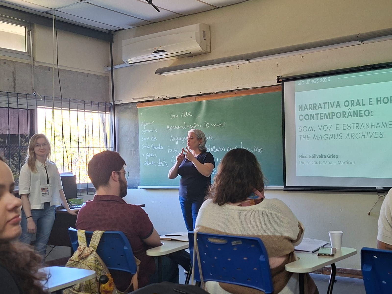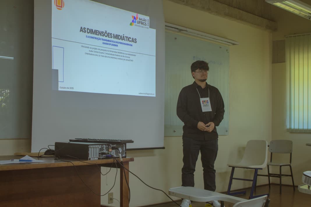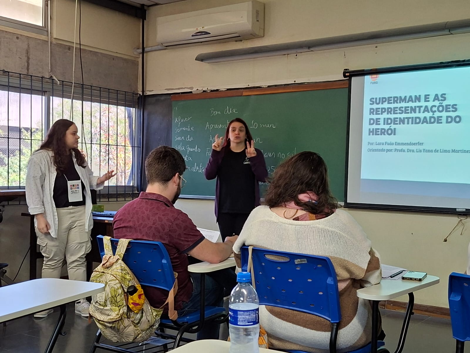 Os estudantes Euller Ochoa Duarte, Nicole Silveira Griep, Lara Fuão Emmendoerfer, Rafaela Gonçalves Oliveira e Juan Machado de Lemos apresentaram suas comunicações vinculadas ao projeto Ciliga: As Dimensões Midiáticas e as Midialidades, coordenado pela professora Yana Martinez. O projeto investiga as relações entre literatura, cinema e videogames, com foco em narrativas, remidiação e interatividade, explorando a natureza midiática das produções contemporâneas.