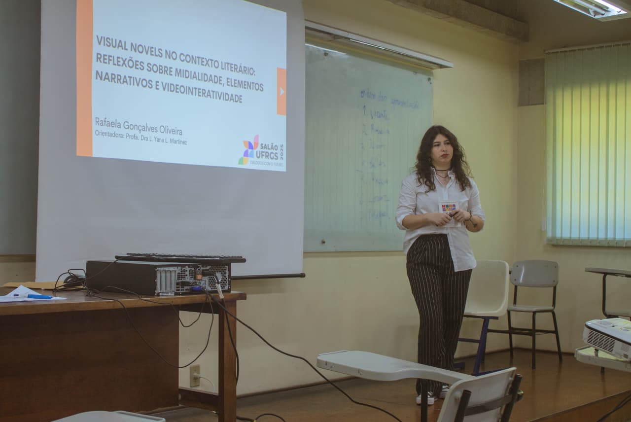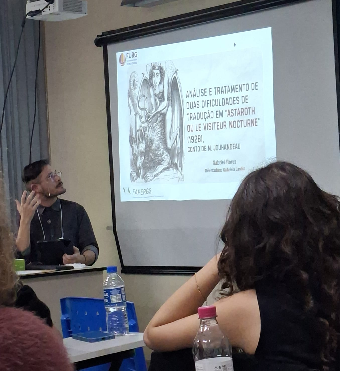 Já o estudante Gabriel Flores apresentou sua pesquisa vinculada ao projeto Traduzindo a literatura francesa para o português: da abordagem teórica à prática tradutória, coordenado pela professora Gabriela Jardim. A pesquisa propõe reflexões sobre o processo tradutório como prática crítica e criativa, articulando teoria literária e prática de tradução.