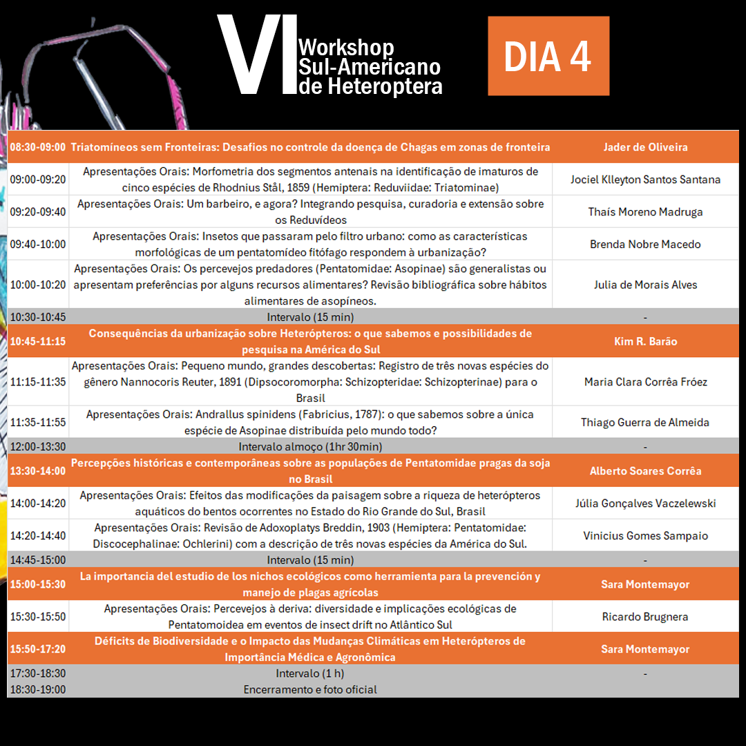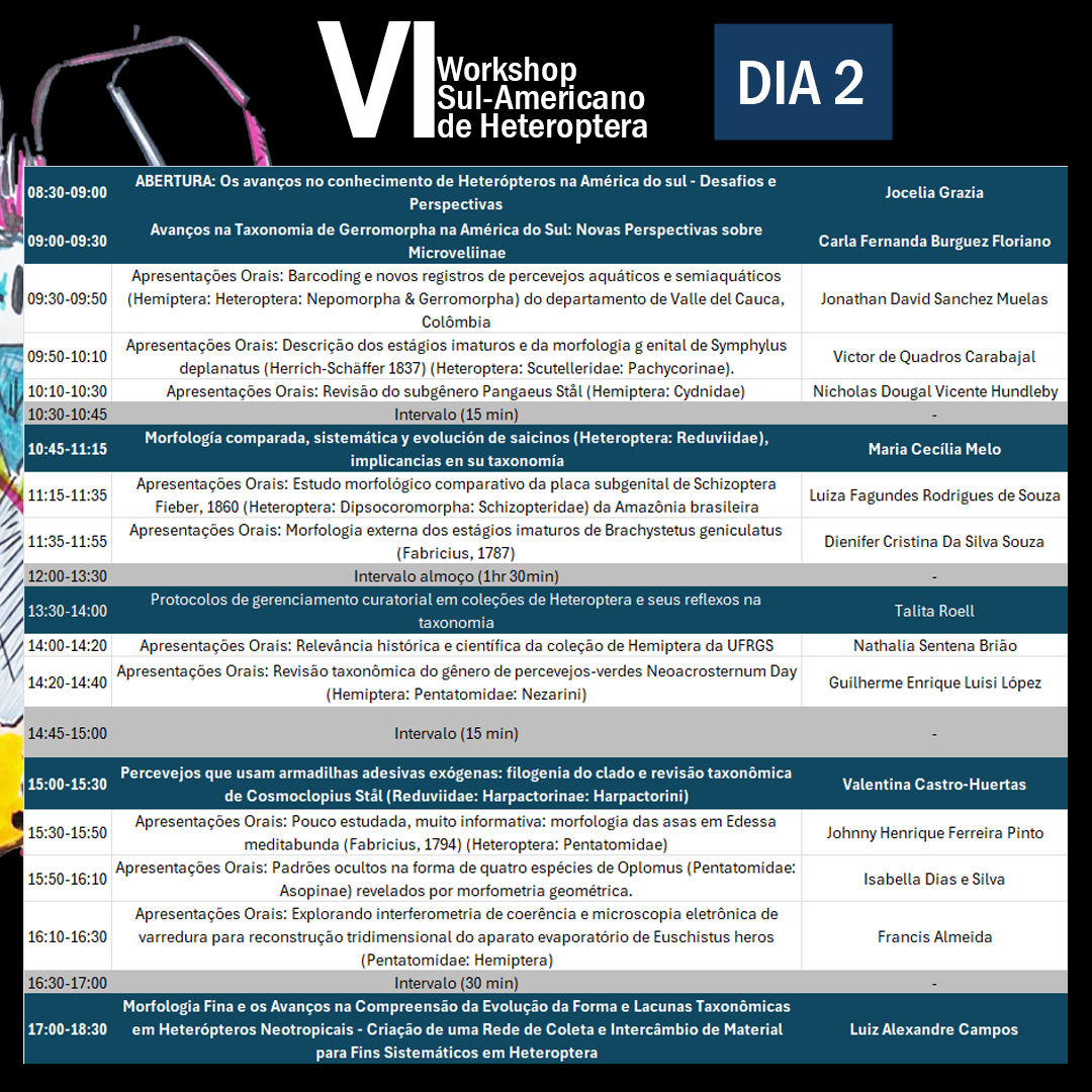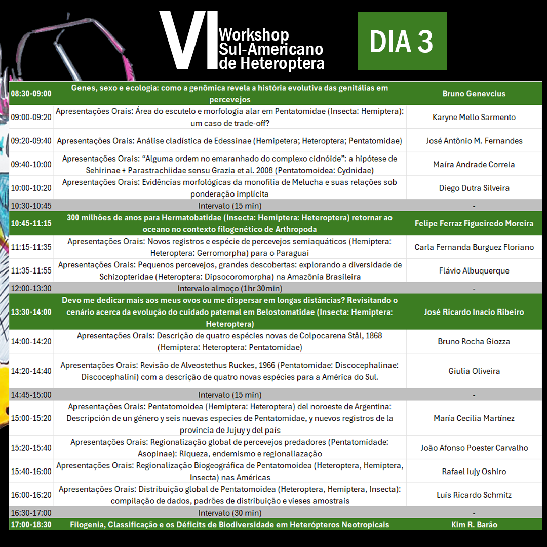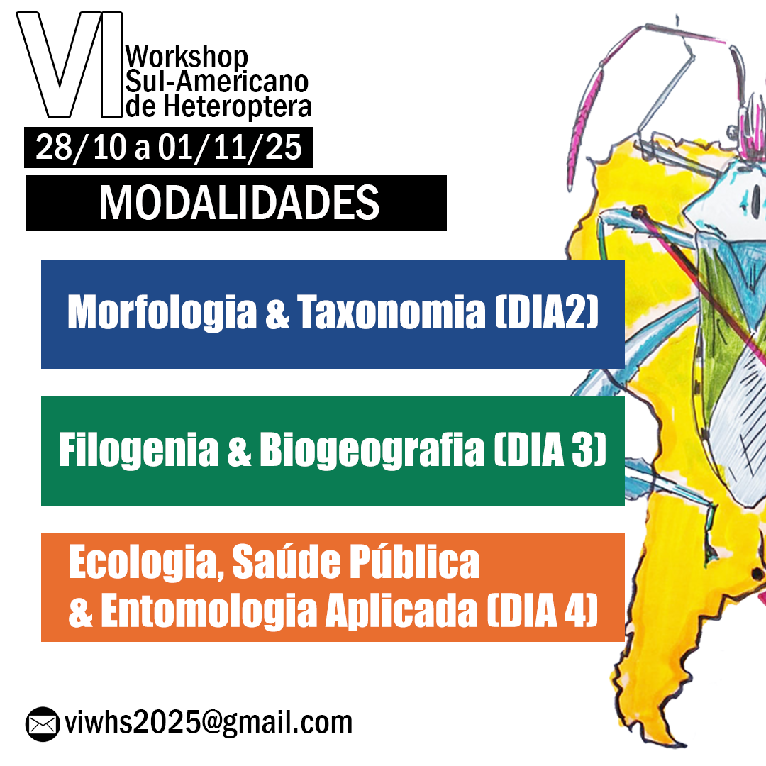 Também estão previstos os workshops temáticos: Morfologia Fina e os Avanços na Compreensão da Evolução da Forma; Lacunas Taxonômicas em Heterópteros Neotropicais - Criação de uma Rede de Coleta e Intercâmbio de Material para Fins Sistemáticos em Heteroptera; Filogenia, Classificação e os Déficits de Biodiversidade em Heterópteros Neotropicais; Déficits de Biodiversidade e o Impacto das Mudanças Climáticas em Heterópteros de Importância Médica e Agronômica.