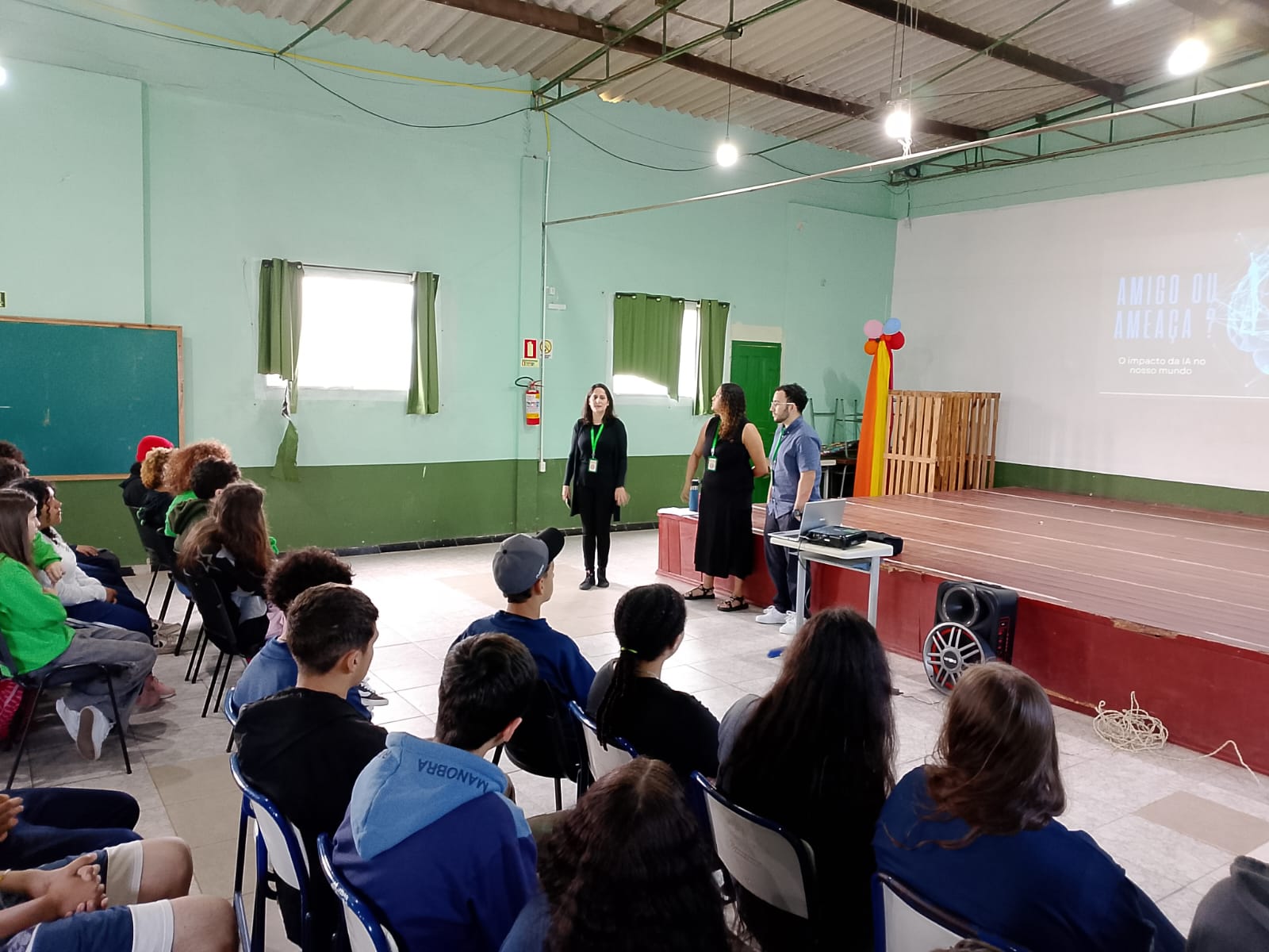 A atividade foi realizada no último dia 23 e incluiu dinâmica interativa sobre o uso da inteligência artificial na geração de imagens. Yuri conta como a abordagem foi pensada pelo dois: "Nossa meta era mostrar a eles um panorama completo: os riscos atuais, as ocorrências e os impactos que a IA já causa no dia a dia, e quais são as perspectivas para o futuro com essa tecnologia. Tudo isso, unindo a visão pedagógica dela à minha perspectiva técnica, trazendo muitas notícias e curiosidades sobre o tema".