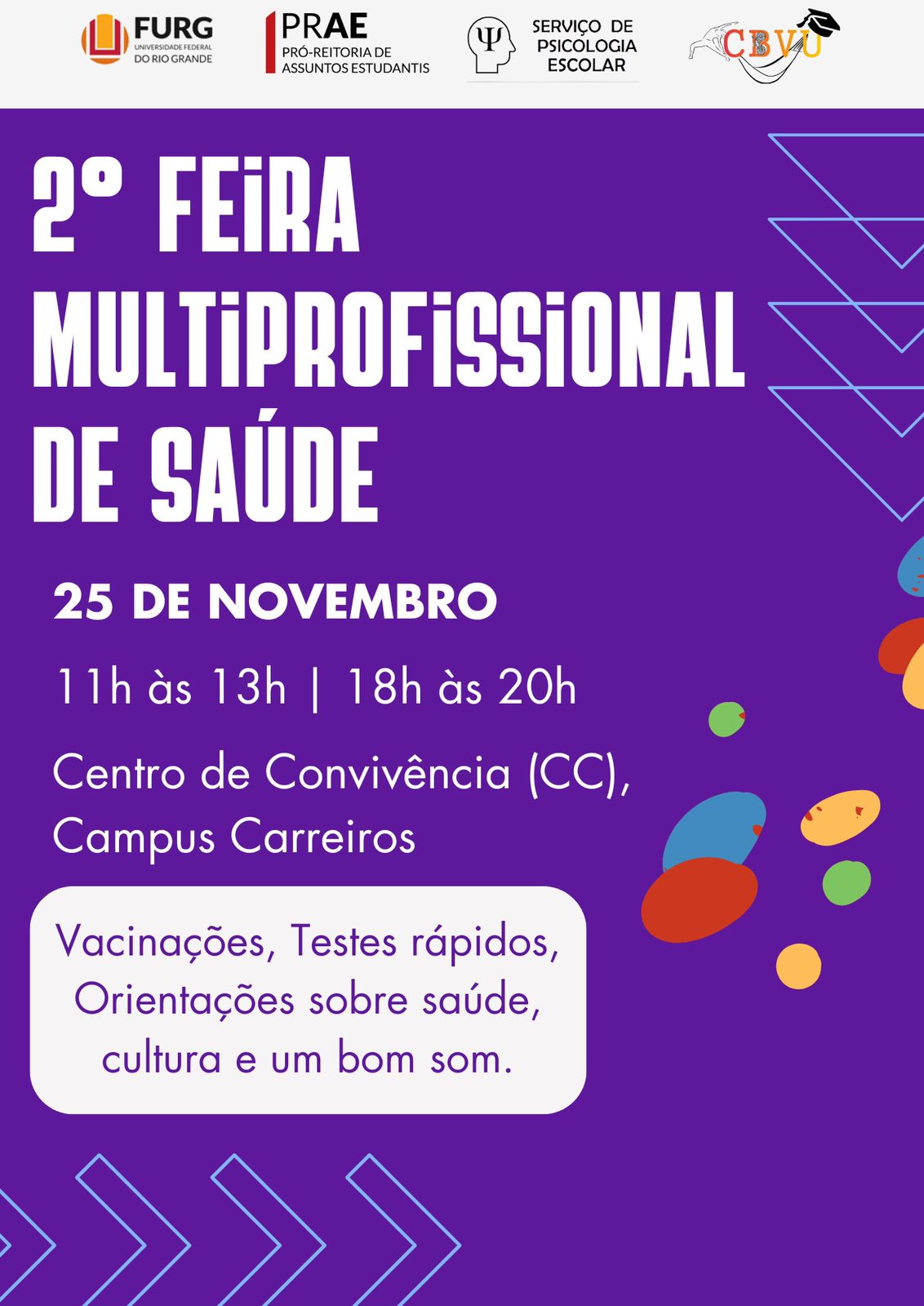 Nesta terça-feira, 25, o Centro de Convivência do Campus Carreiros da Universidade Federal do Rio Grande (FURG) recebe a segunda edição da Feira Multiprofissional de Saúde. O evento começa às 11h, com atividades até às 13h e segue em nova etapa das 18h às 20h.
