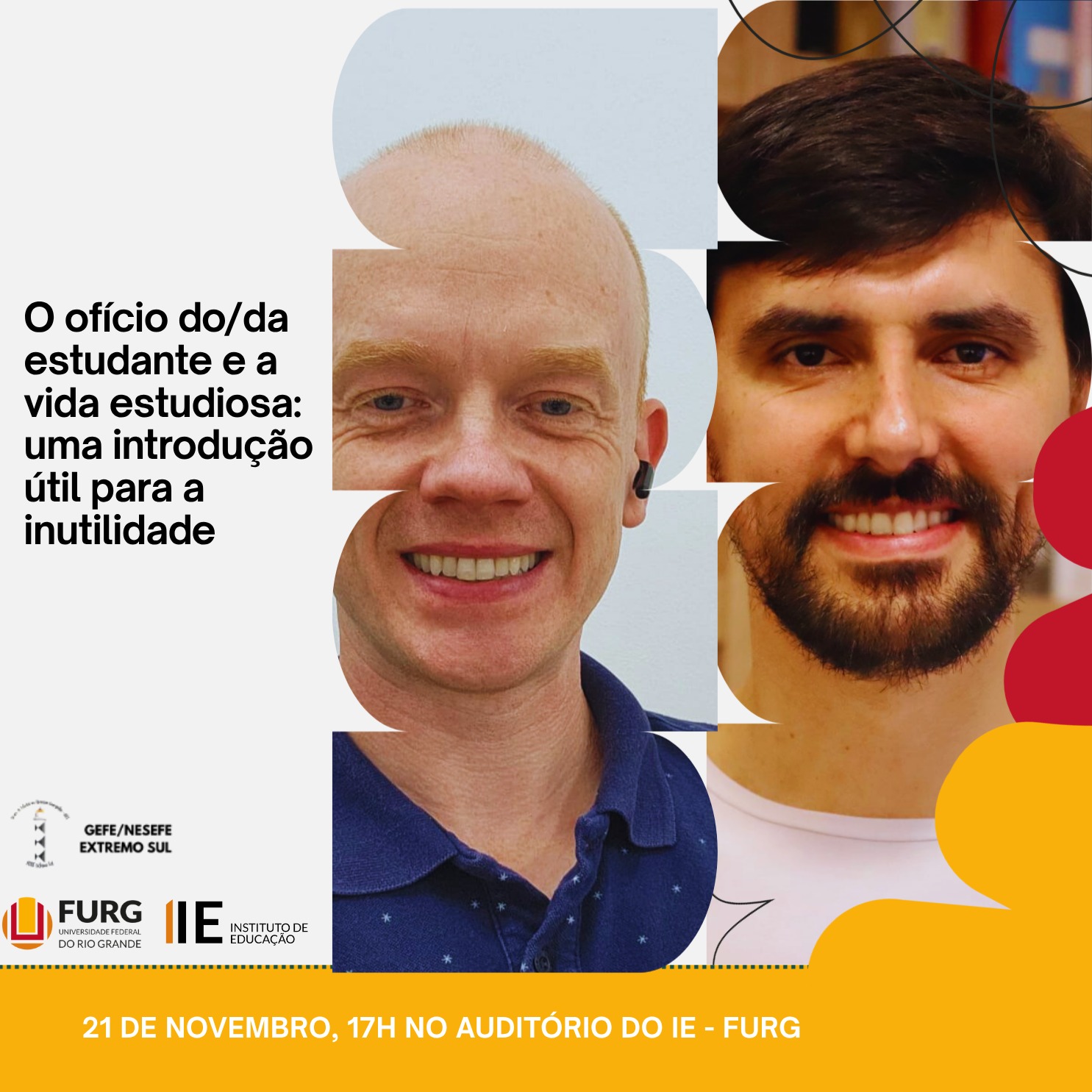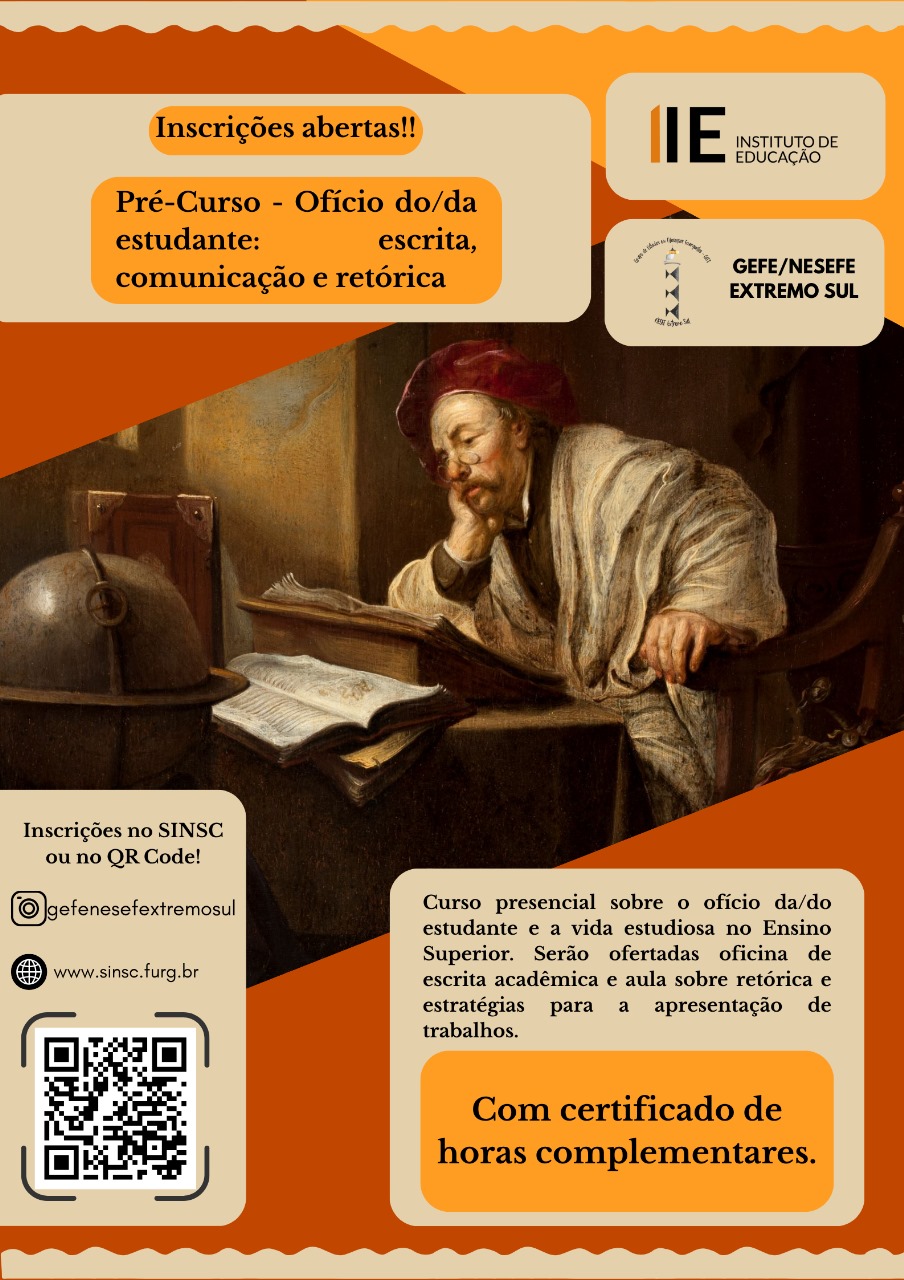 O Grupo de Estudos em Filosofias Emergentes (GEFE) e o Núcleo de Educação Filosófica do Extremo Sul (NESEF), do Instituto de Educação da Universidade Federal do Rio Grande (IE/FURG), promovem um pré-curso com atividades formativas sobre as especificidades da vida acadêmica no ensino superior.