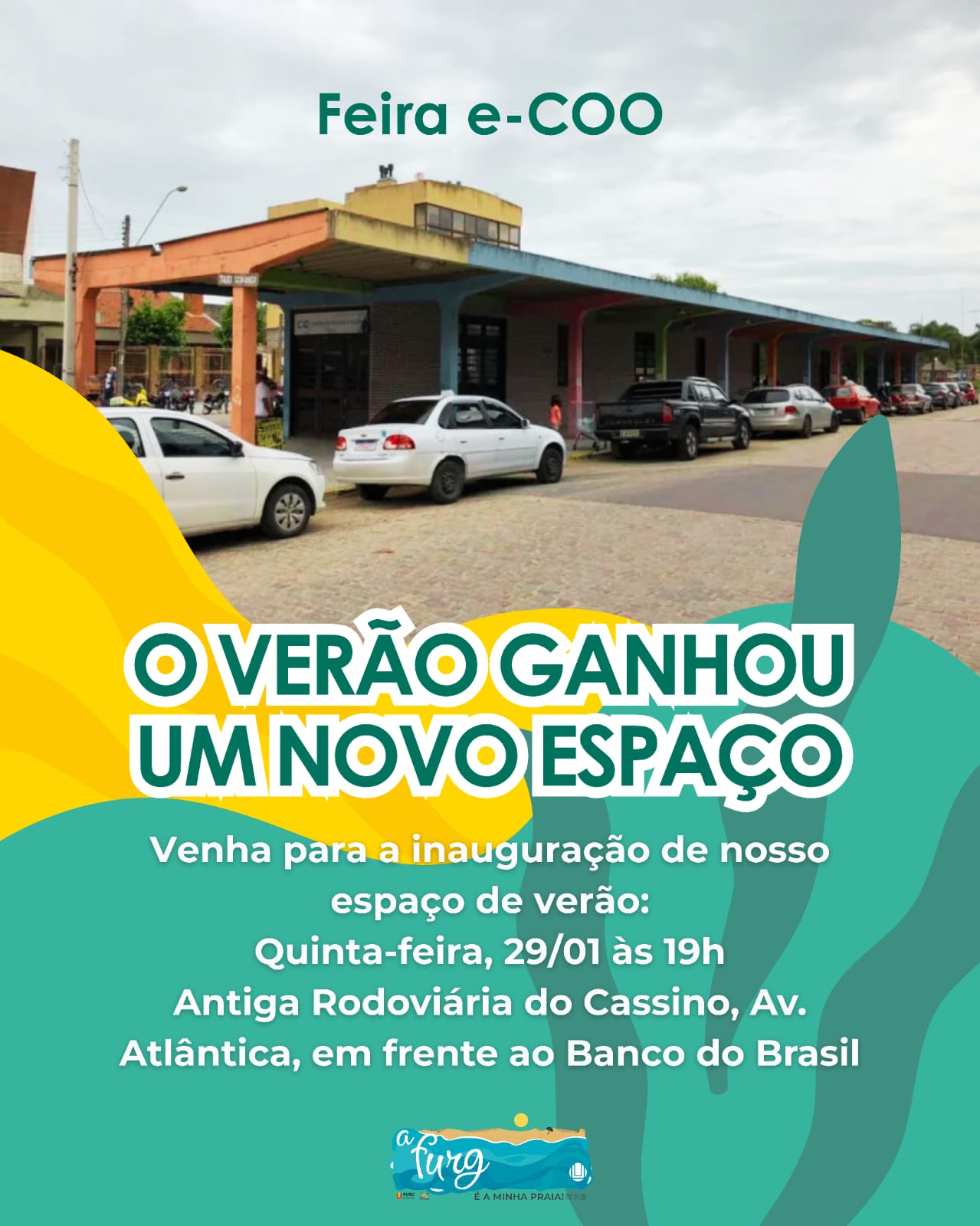 O projeto e-Coo inaugura novo endereço no Cassino nesta quinta-feira, 29, às 19h. O espaço fica na antiga rodoviária do Cassino, na Av. Atlântica, em frente ao Banco do Brasil. A feira de agricultura familiar recebe a comunidade interessada até as 22h no novo local. Confira vídeo sobre o evento AQUI.
