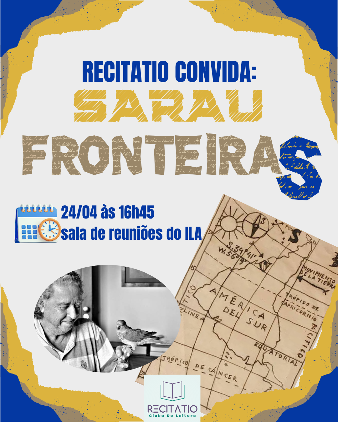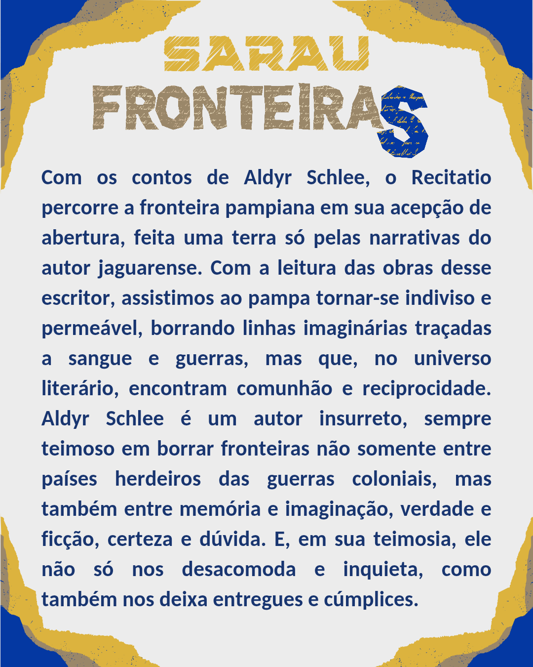 O projeto Recitatio realiza, na próxima sexta-feira, 24, o sarau literário Fronteira(S), dedicado à obra do escritor Aldyr Schlee. Será na sala de reuniões do Instituto de Letras e Artes da Universidade Federal do Rio Grande (ILA/FURG), Campus Rio Grande, Unidade Carreiros, às 16h45.