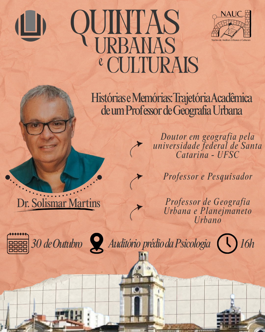 O Quintas Urbanas e Culturais encerra a edição de 2025 com a palestra Histórias e Memórias: Trajetória de um Professor de Geografia Urbana, ministrada pelo prof. dr. Solismar Fraga Martins. Será na quinta-feira, 30, às 16h, no auditório do Prédio da Psicologia.