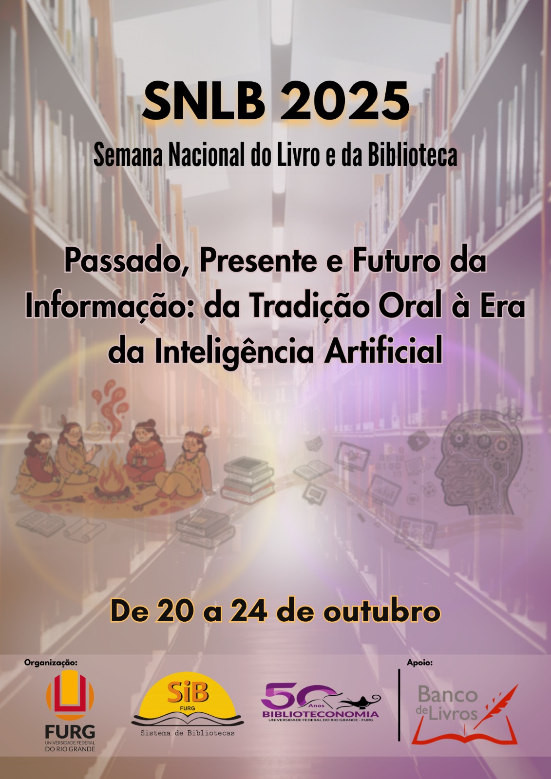 O Sistema de Bibliotecas da Universidade Federal do Rio Grande (SiB/FURG), em parceria com o curso de Biblioteconomia, preparam para os dias 20 a 24 de outubro a Semana Nacional do Livro e da Biblioteca - 2025. Com o tema “Passado, Presente e Futuro da Informação: da Tradição Oral à Era da Inteligência Artificial”, o evento conta com ações alusivas à data nacional, celebrada entre 23 e 29 de outubro em todo país.