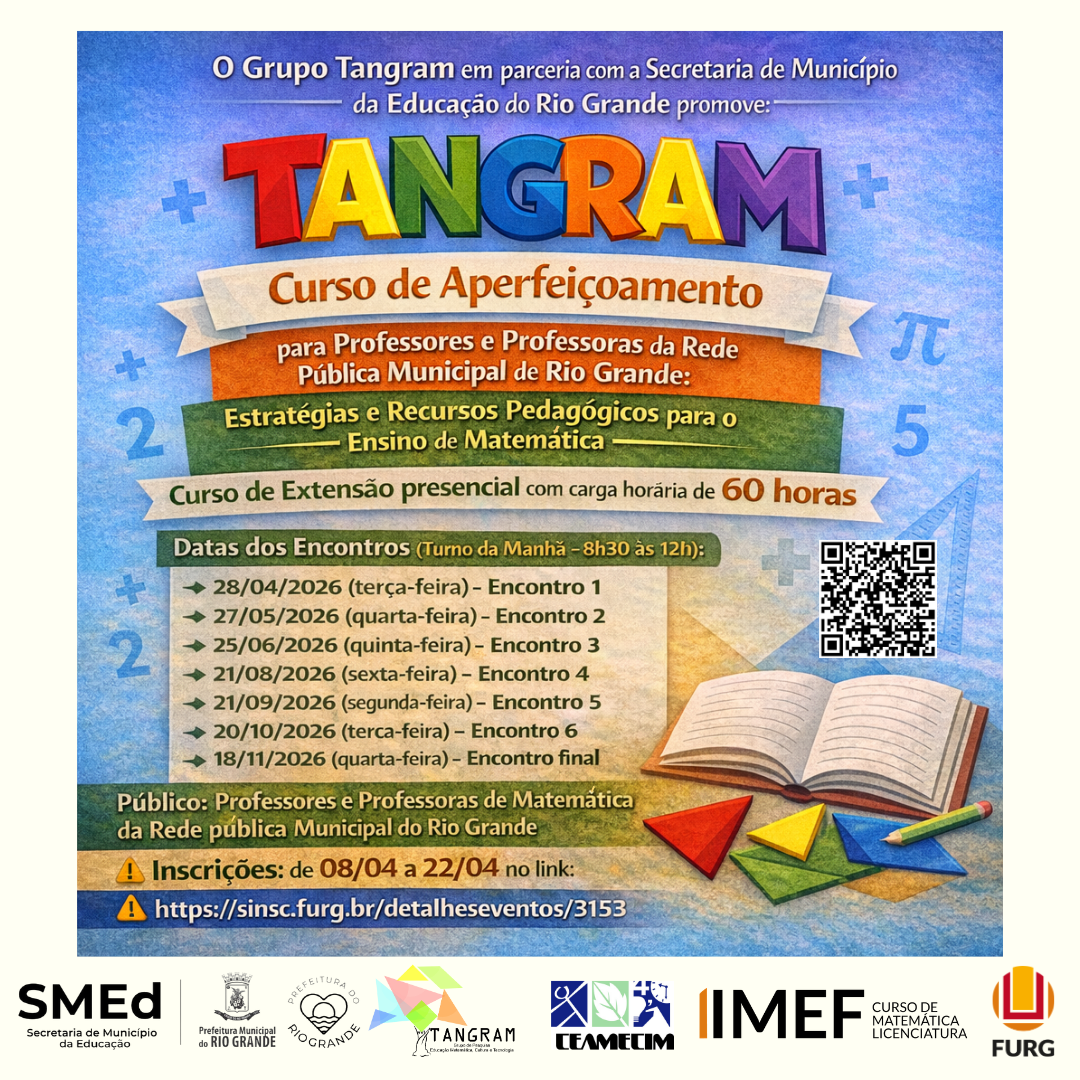 Estão abertas, de 8 a 22 de abril, as inscrições para o curso de aperfeiçoamento Tangram – Estratégias e Recursos Pedagógicos para o Ensino de Matemática, voltado a professores e professoras de Matemática da rede pública municipal de Rio Grande. A iniciativa é promovida pelo Grupo Tangram do Instituto de Matemática, Estatística e Física (IMEF) da FURG, em parceria com a Secretaria de Município da Educação.