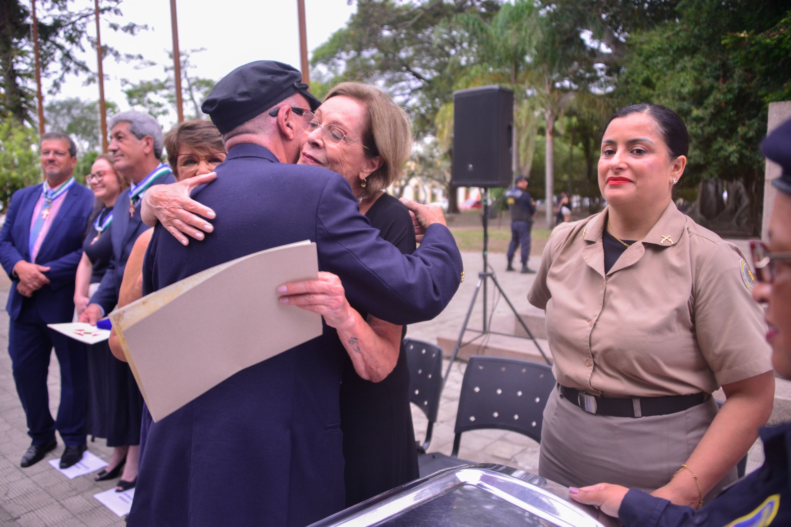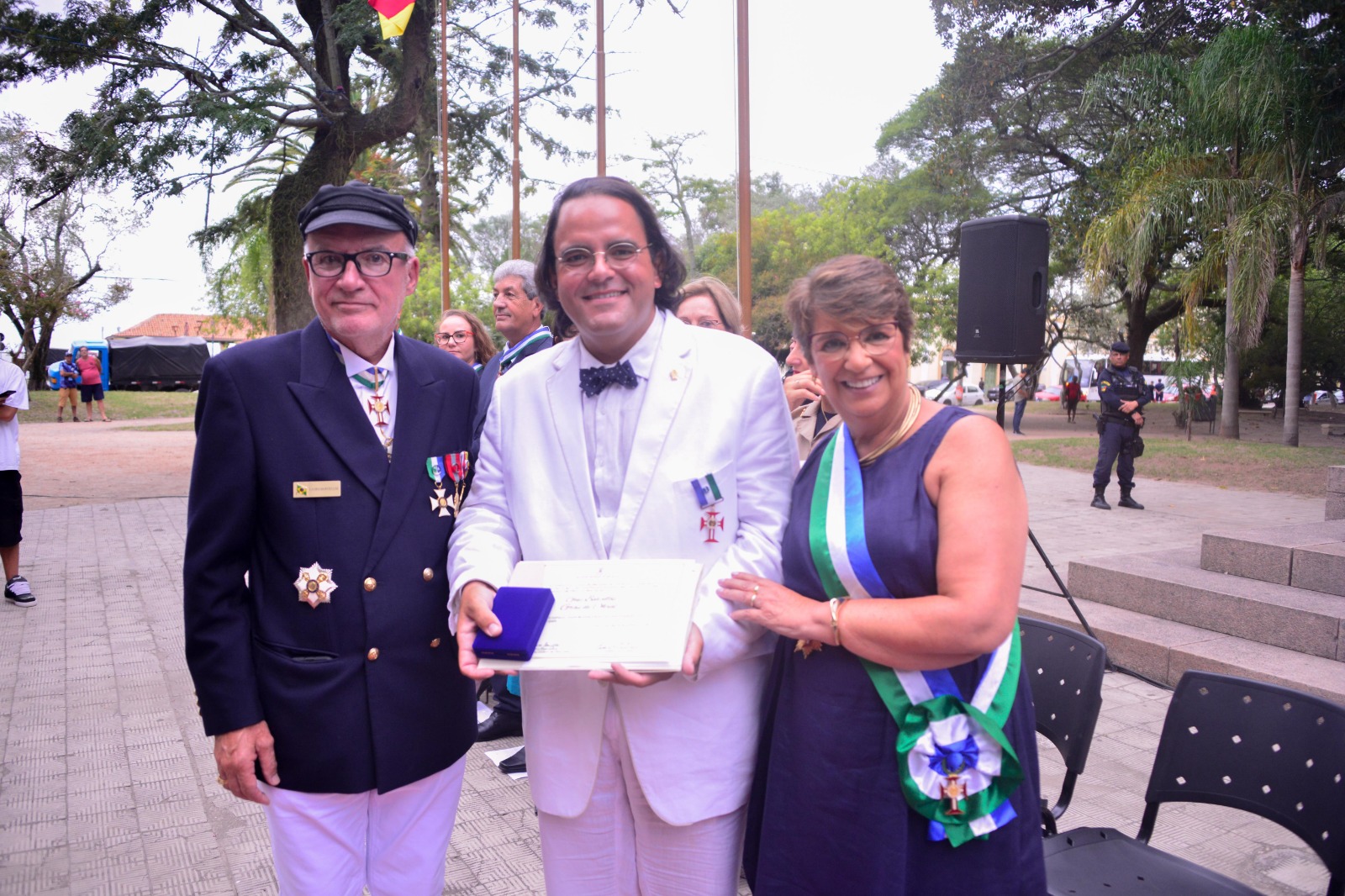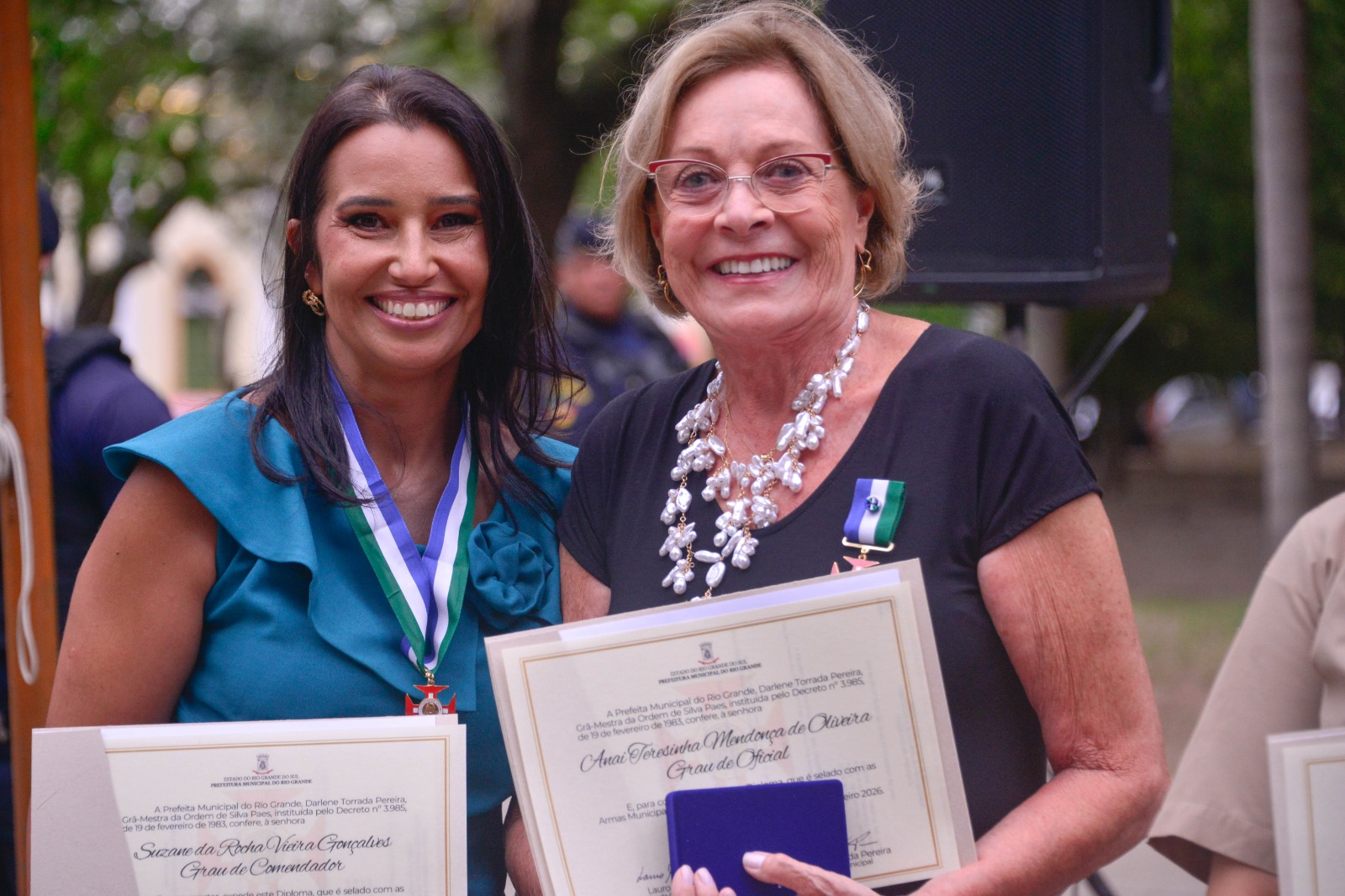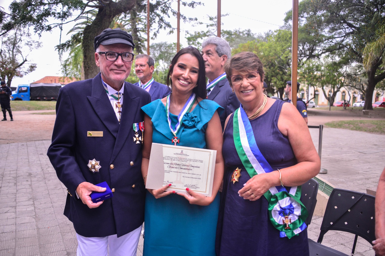 No grau de Oficial, também receberam a honraria a soldado da Brigada Militar, atual coordenadora da Patrulha Maria da Penha de Rio Grande, Giovana Duarte Musseli; e o comandante da Capitania dos Portos, Gutemberg da Silva Ferreira.