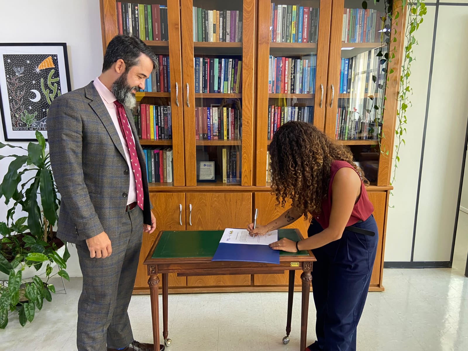 Ela conta que, a partir do segundo ano de graduação, atuou como bolsista e voluntária nos projetos do Repositório Institucional e Portal de Periódicos da FURG, tendo a professora Angélica como orientadora. "A professora me incentivou a fazer pesquisas, participar em eventos nacionais e internacionais, como a Conferência Lusófona de Ciência Aberta e o Encontro Nacional de Portais de Periódicos. Durante a graduação também tive a oportunidade de fazer uma mobilidade acadêmica na Universidade de Coimbra, em Portugal. As disciplinas, os professores, os estágios e bolsas por onde passei foram cruciais para minha formação profissional."