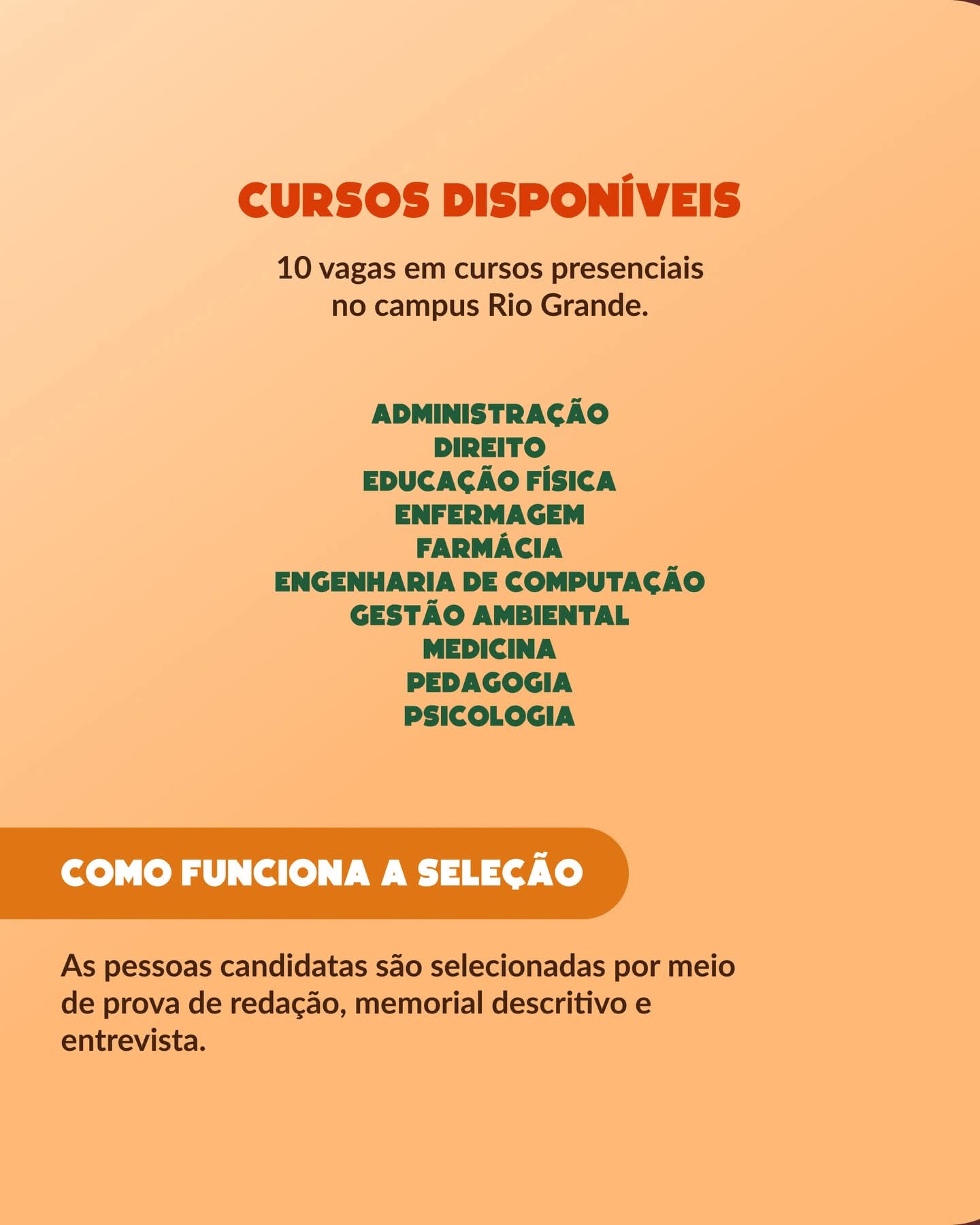 São oferecidas 10 vagas, uma para cada curso participante: Administração, direito, Educação Física, Enfermagem, farmácia, Engenharia de Computação, Gestão Ambiental, Medicina, pedagogia e Psicologia. A seleção será composta de três etapas: Prova de Redação presencial no dia 8 de fevereiro (peso de 40% na nota final); Memorial Descritivo entregue no dia da prova (peso de 30% na nota final) e Entrevista (peso de 30% na nota final). Os locais de prova serão Rio Grande, Mostardas, Passo Fundo e São Lourenço do Sul.