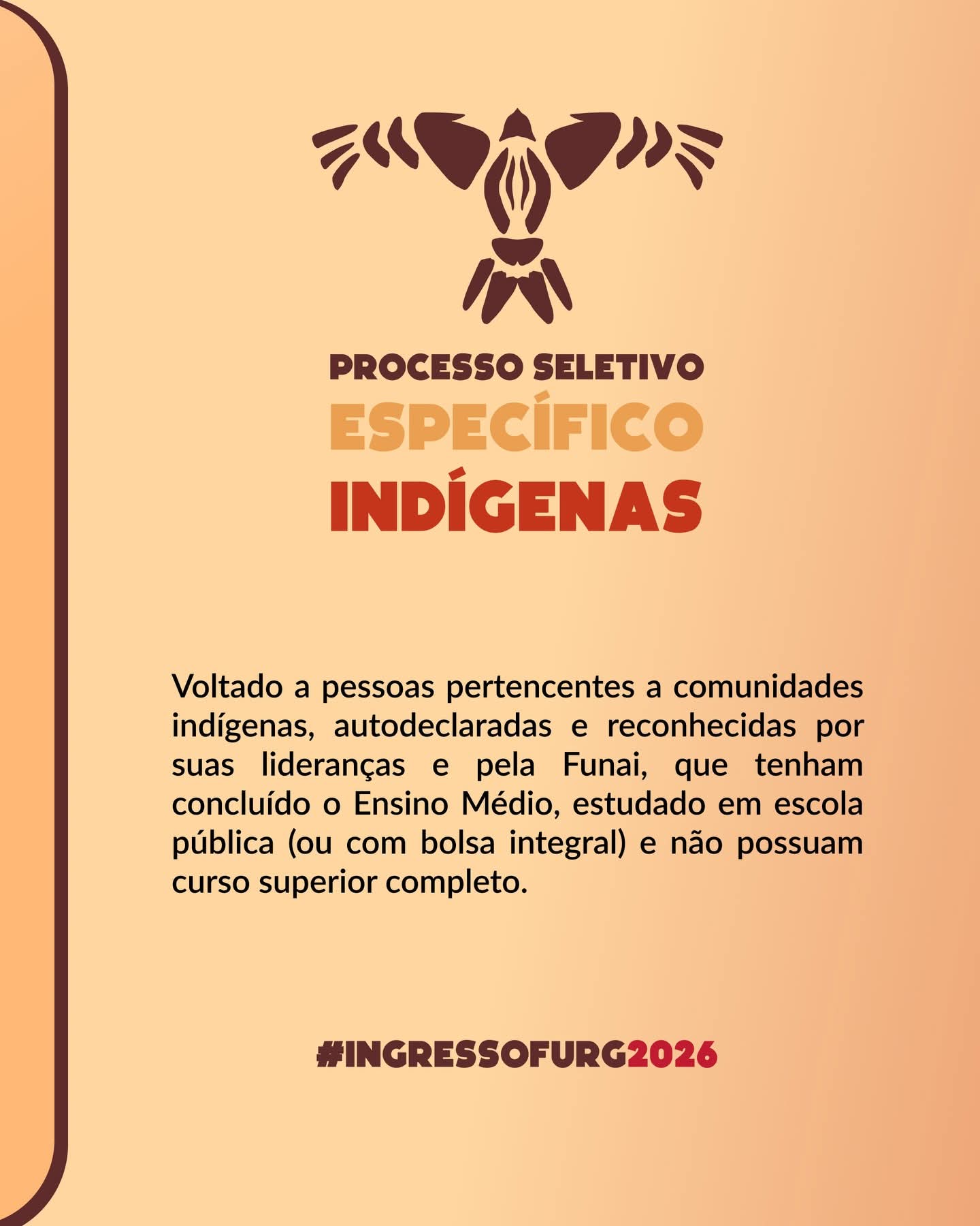 O Edital para Processo Seletivo Específico para Ingresso de Estudantes Indígenas é voltado a pessoas indígenas aldeadas, reconhecidas pelas suas lideranças e pela Fundação Nacional dos Povos Indígenas (Funai), que tenham concluído o ensino médio até a matrícula; tenham estudado em escola pública (ou com bolsa integral em particular); e não tenham curso superior completo.