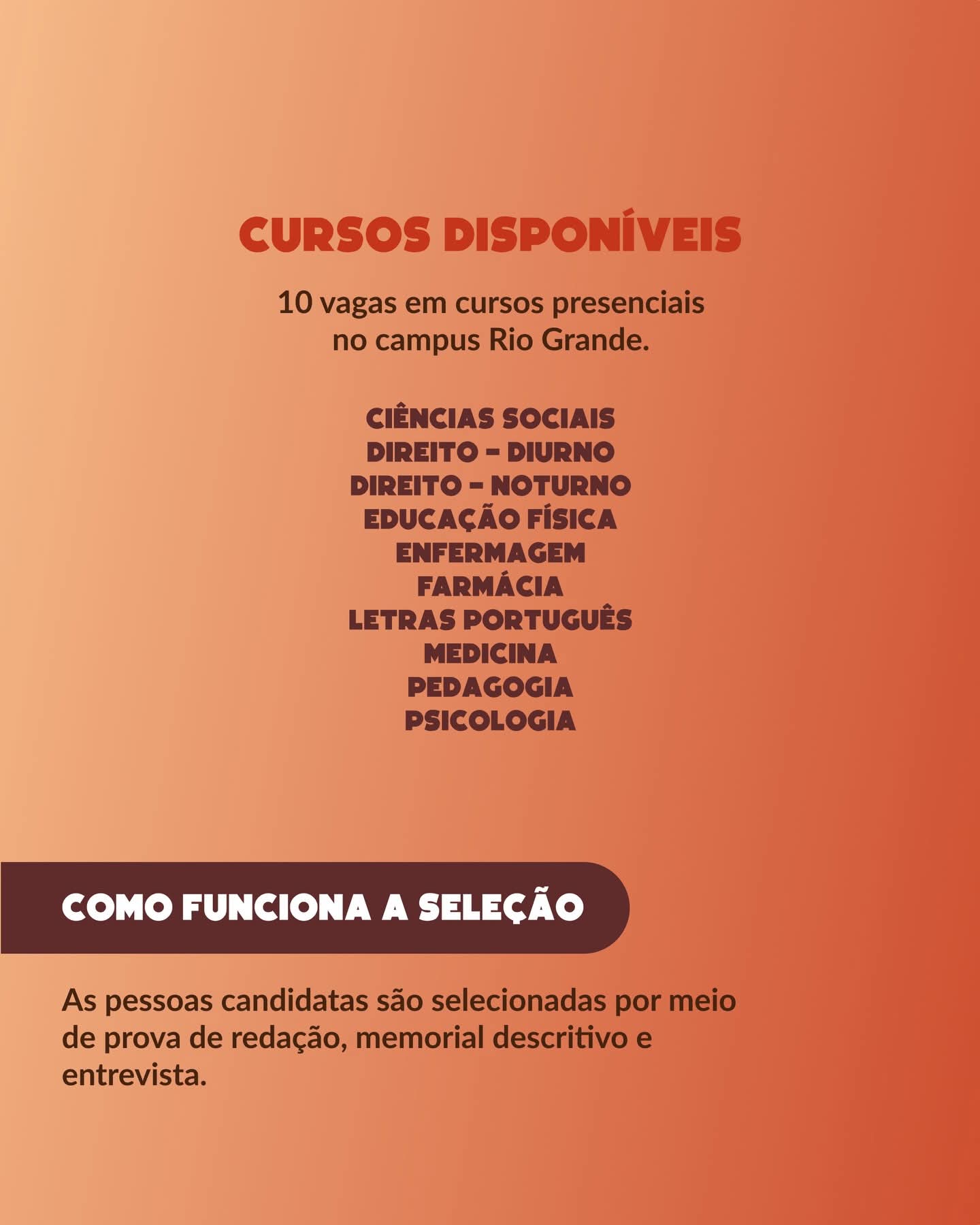 São oferecidas 10 vagas, uma para cada curso participante: Ciências Sociais, Direito (diurno e noturno), Educação Física, Enfermagem, Farmácia, Letras – Português, Medicina, Pedagogia e Psicologia. A seleção será composta de três etapas: Prova de Redação presencial no dia 8 de fevereiro (peso de 40% na nota final); Memorial Descritivo entregue no dia da prova (peso de 30% na nota final) e Entrevista online (peso de 30% na nota final). Os locais de prova serão Rio Grande, Mostardas, Passo Fundo e São Lourenço do Sul.