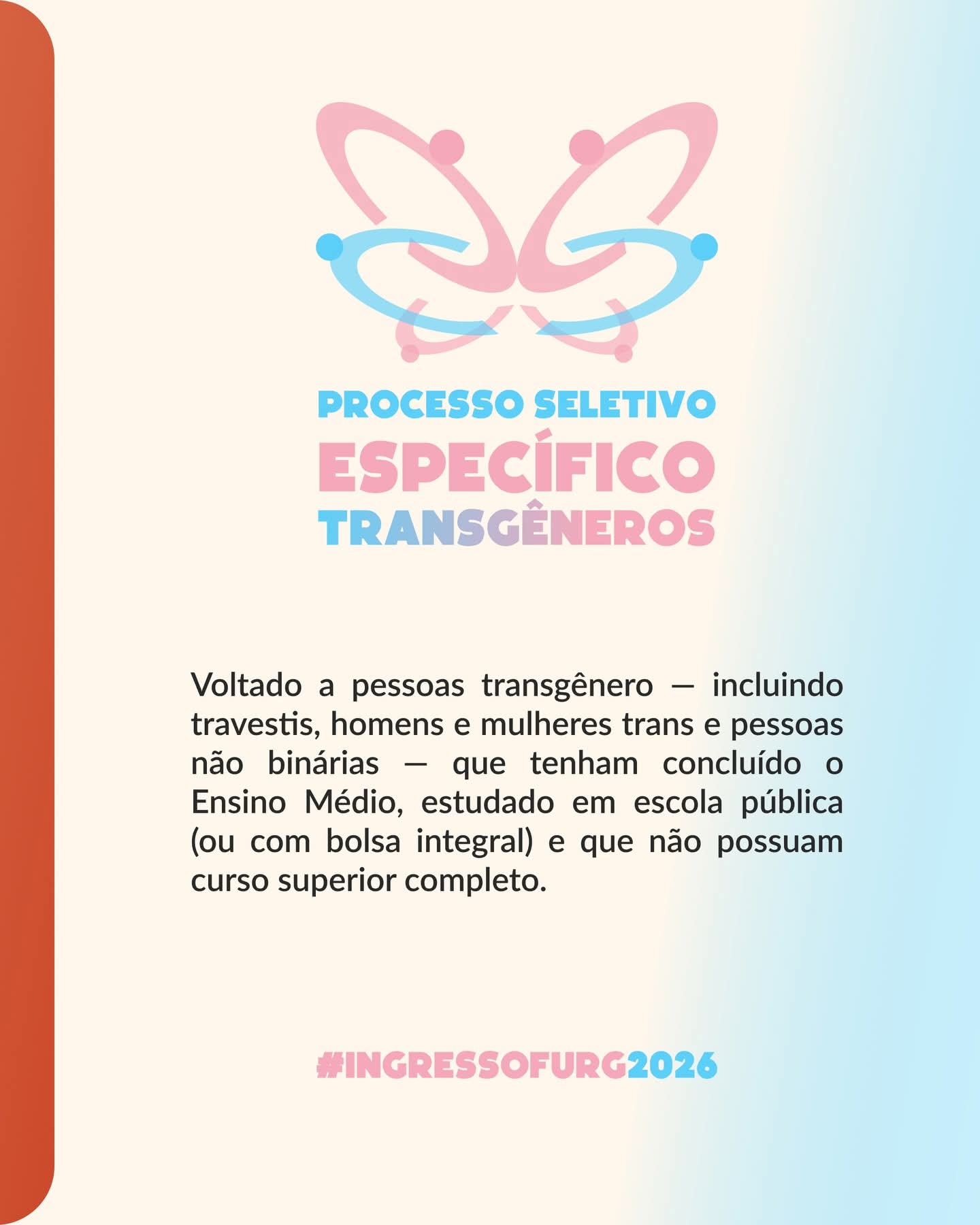 O Edital para Processo Seletivo Específico para Ingresso de Estudantes Transgênero é voltado a pessoas transgênero, incluindo travestis, homens e mulheres trans e pessoas não binárias, que concluíram o ensino médio, estudaram em escola pública (ou com bolsa integral em particular) e não possuem ensino superior completo.