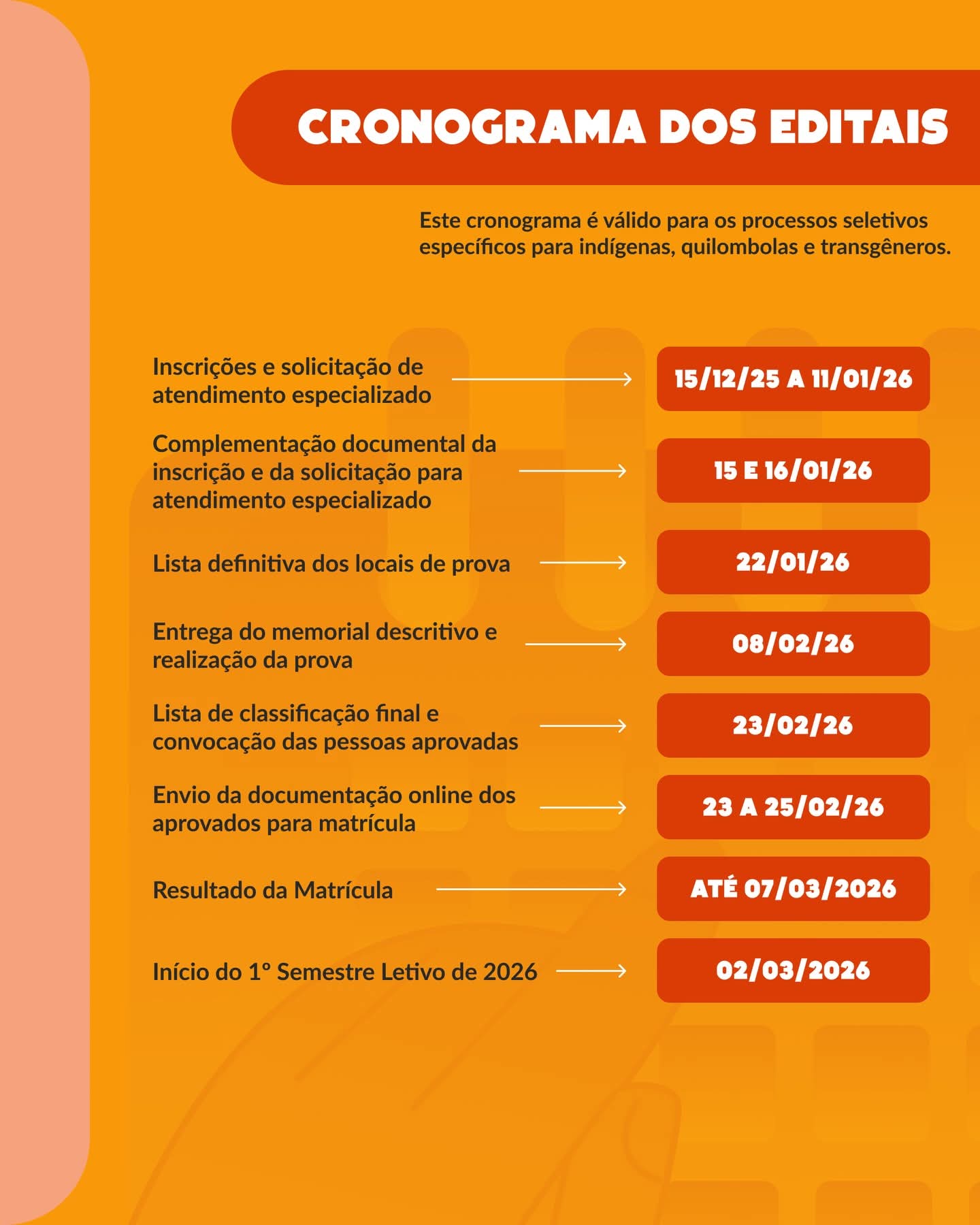 As inscrições iniciam no dia 15 de dezembro de 2025 e seguem até 11 de janeiro de 2026 pelo site da Coperse. Os editais trazem informações sobre cada processo, como vagas ofertadas, quem pode se inscrever, documentação necessária e a forma de seleção. O resultado final será divulgado em 23 de fevereiro de 2026, com período de matrícula de 23 a 25 de fevereiro e início do semestre letivo em 2 de março.