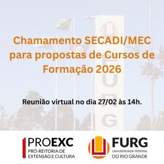A Pró-reitoria de Extensão e Cultura (Proexc) realizará uma reunião remota para esclarecimentos nesta sexta-feira, 27, às 14h. Os interessados devem encaminhar e-mail para: proexc@furg.br ou julianamachado@furg.br.