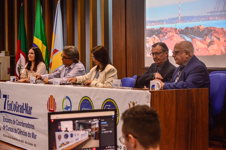 Na última quarta-feira, 3, a FURG sediou a conferência de abertura do 7º Encontro de Coordenadores de Curso de Ciências do Mar, evento que se estendeu ao longo da semana. A ação reuniu representantes de instituições de todo o país para discutir avanços, desafios e perspectivas na formação superior da área, contando com a organização do Instituto de Oceanografia (IO); da Comissão Interministerial para os Recursos do Mar (CIRM); do Comitê Executivo para a Formação de Recursos Humanos em Ciências do Mar (PPG-Mar/Marinha do Brasil); e do Ministério da Educação (MEC).