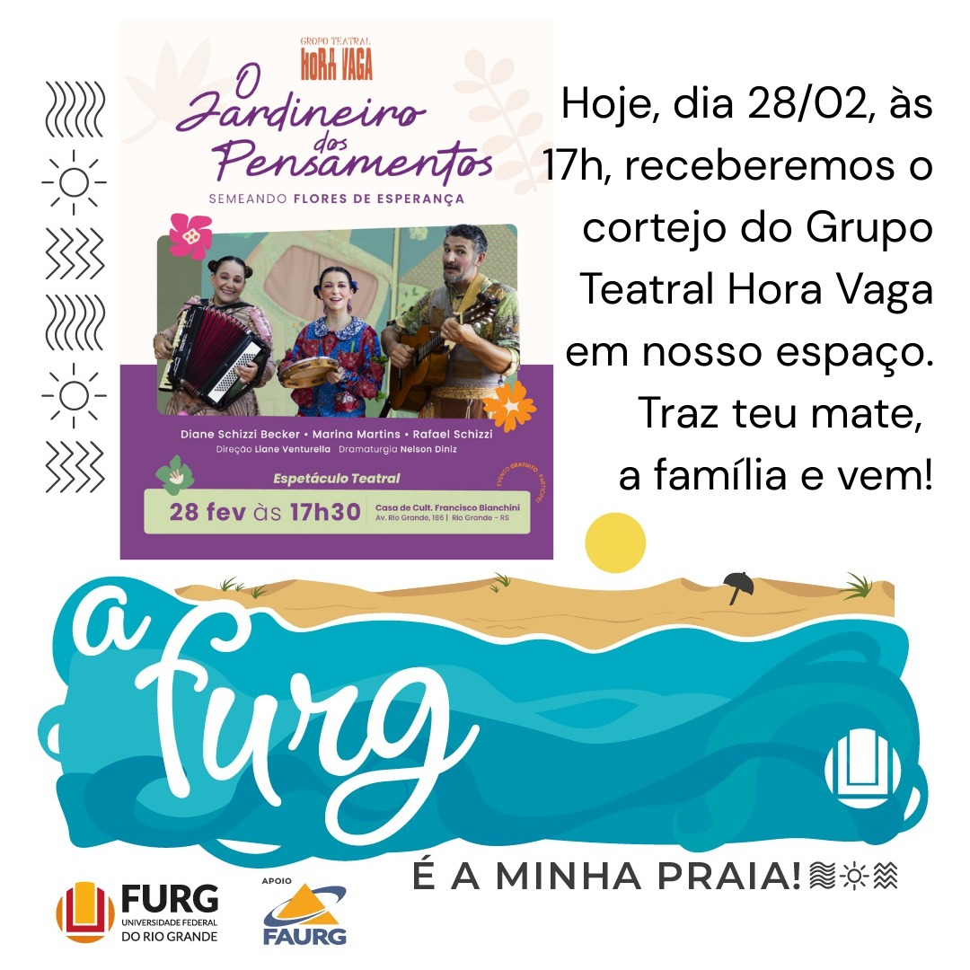 O projeto institucional "A FURG é a minha praia!" da Universidade Federal do Rio Grande (FURG) finaliza as atividades de verão na Avenida Rio Grande, no Cassino, neste final de semana. A programação traz para este sábado, às 17h, o cortejo do Grupo Teatral Hora Vaga, formado por Diane Schizzi Becker, Marina Martins e Rafael Schizzi. Na sequência, às 17h, o grupo apresenta o espetáculo teatral "O jardineiro dos Pensamentos - semeando flores de esperança", na Casa de Cultura Francisco Bianchini (Av. Rio Grande, 186), com direção de Liane Venturella e dramaturgia de Nelson Diniz.