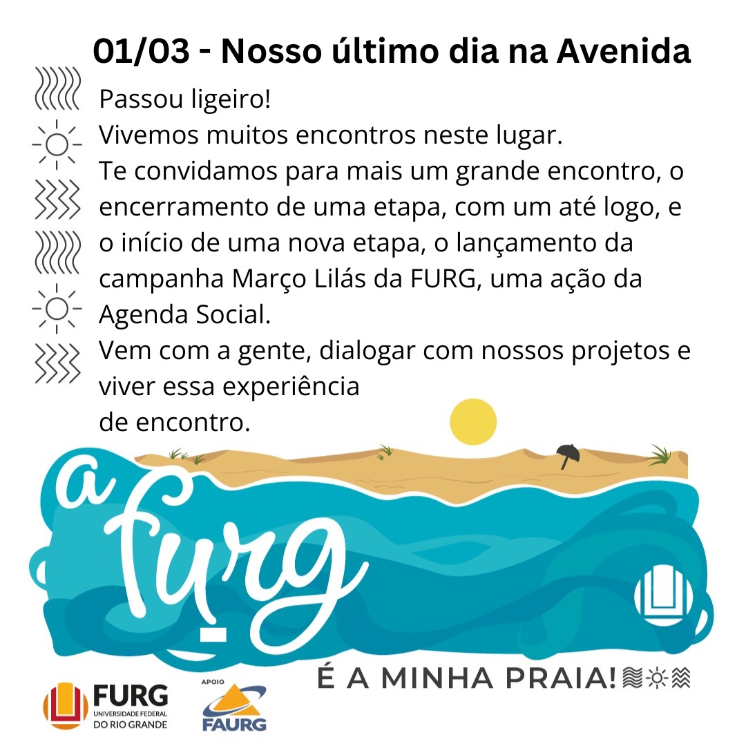 O projeto "A FURG é a minha praia!" está na praia desde 16 de janeiro, promovendo a aproximação da universidade com a comunidade. A partir de estrutura física e móvel, o espaço promove a interação, o diálogo e a troca de conhecimentos entre a comunidade acadêmica e a comunidade em geral, fortalecendo ações de ensino, pesquisa, extensão, cultura, inovação.