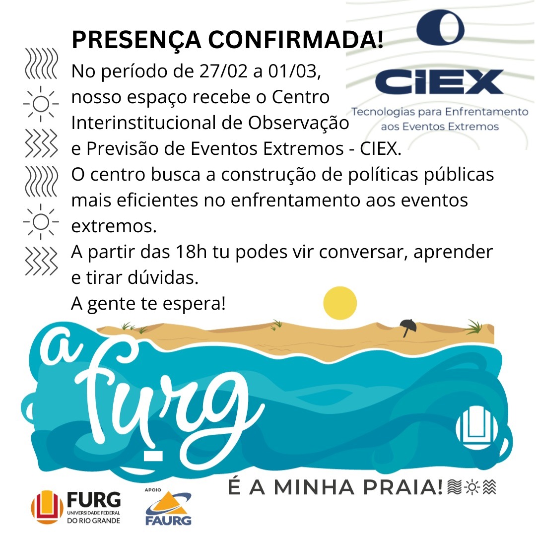 As atividades, das 18h às 22h, incluem divulgação de cursos, programas, grupos e coletivos, ações e projetos de cultura, extensão, ensino, sustentabilidade, pesquisa e inovação. O destaque nesse final de semana é a participação, desde sexta-feira, 27, do Centro Interinstitucional de Observação e Previsão de Eventos Extremos (Ciex). O centro une inovação e tecnologia para o enfrentamento das crises climáticas na região e conta com quatro instituições colaboradoras: FURG e as universidades federais de Pelotas (UFPel) e do Rio Grande do Sul (UFRGS) e Agência para o Desenvolvimento da Bacia da Lagoa Mirim (ALM), além da multinacional Pixforce e mais de 20 instituições apoiadoras.