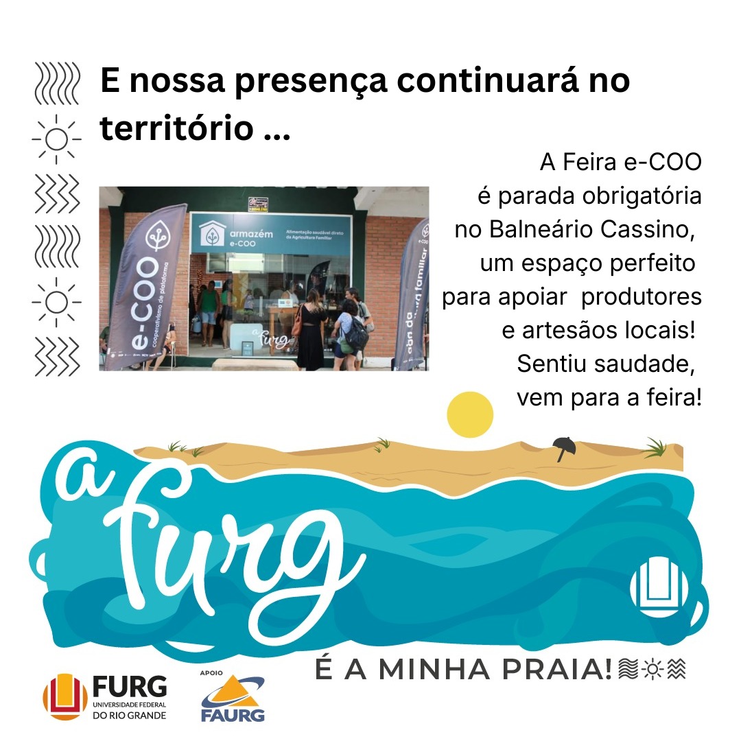 Além de reforçar o convite à comunidade para prestigiar as ações do final de semana de encerramento, a pró-reitora destaca que a FURG segue presente no balneário Cassino com a Feira E-coo, na antiga rodoviária, em frente ao Banco do Brasil.