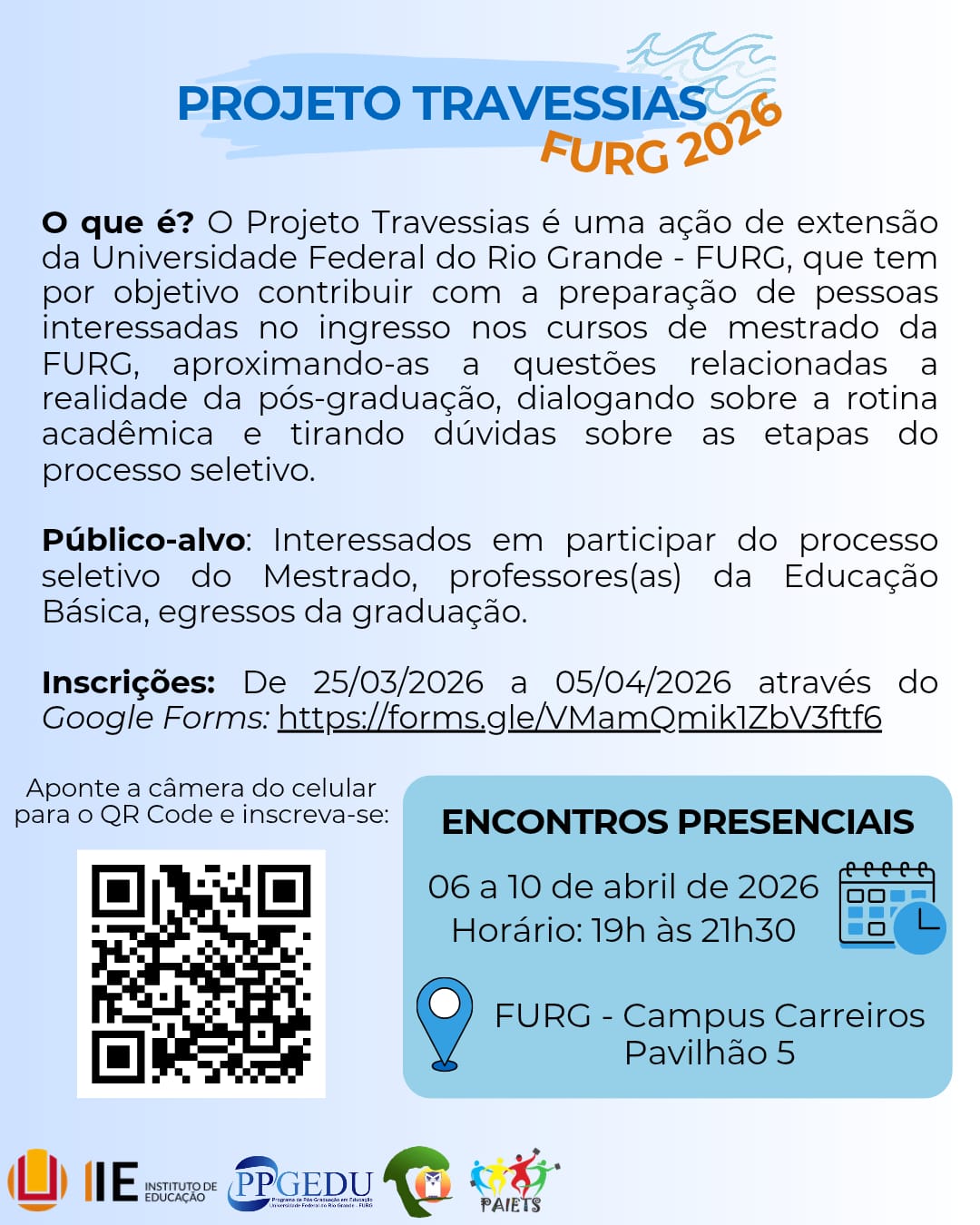 Estão abertas as inscrições para o Projeto Travessias, uma ação de extensão da Universidade Federal do Rio Grande (FURG) voltada à preparação de candidatos interessados em ingressar nos cursos de mestrado da instituição. A iniciativa é coordenada pelo Programa de Auxílio ao Ingresso nos Ensinos Técnicos e Superior, em parceria com o Programa de Pós-Graduação em Educação e o Programa de Pós-Graduação em Educação Ambiental. O objetivo é contribuir com a qualificação dos participantes para os processos seletivos da pós-graduação, oferecendo orientações e suporte acadêmico.