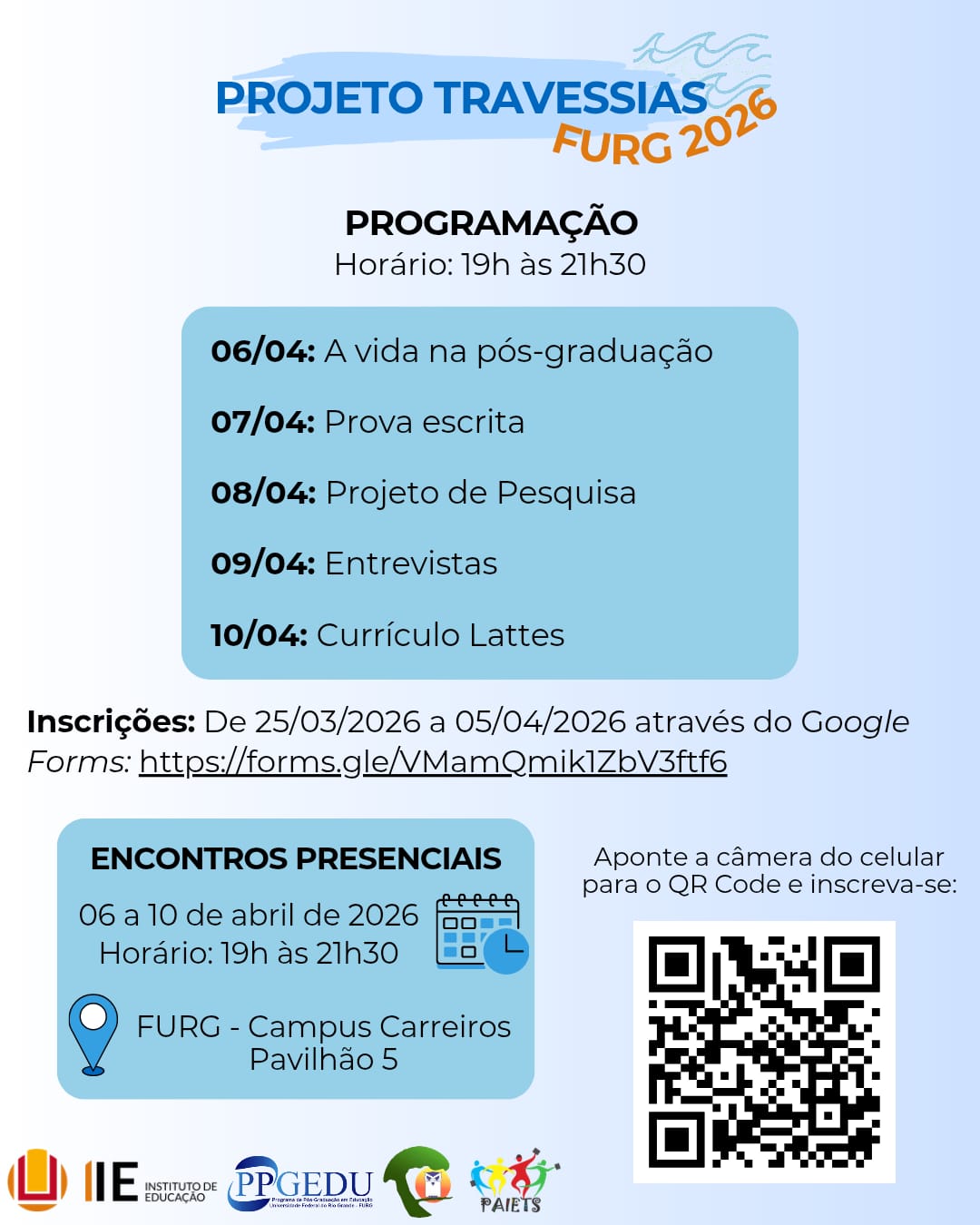 As atividades serão realizadas entre os dias 6 e 10 de abril de 2026, sempre no período noturno, com início às 19h e término previsto para as 22h. Os encontros acontecerão de forma presencial no Campus Carreiros da FURG, no Pavilhão 5, em Rio Grande.