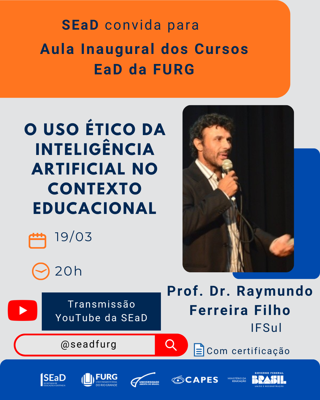 A aula inaugural traz o tema "O uso ético da Inteligência Artificial no contexto educacional", em um debate atual para refletir sobre os impactos da IA na educação, com o prof. dr. Raymundo Carlos Machado Ferreira Filho, do Instituto Federal de Educação, Ciência e Tecnologia Sul-rio-grandense (IFSul). Será na próxima quinta-feira, 19, às 20h, em formato online, com transmissão ao vivo pelo canal da Sead no Youtube.