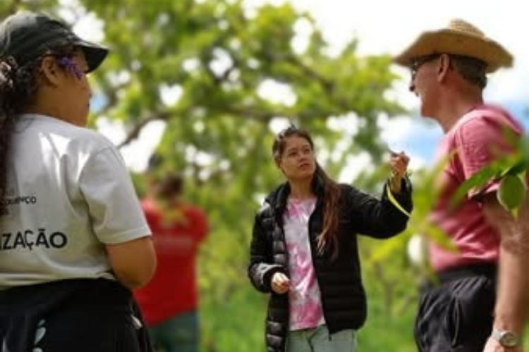 Durante a atividade, os estudantes observaram a diferença entre o pomar agroecológico e o convencional, destacando como a diversidade vegetal está relacionada ao equilíbrio do sistema.