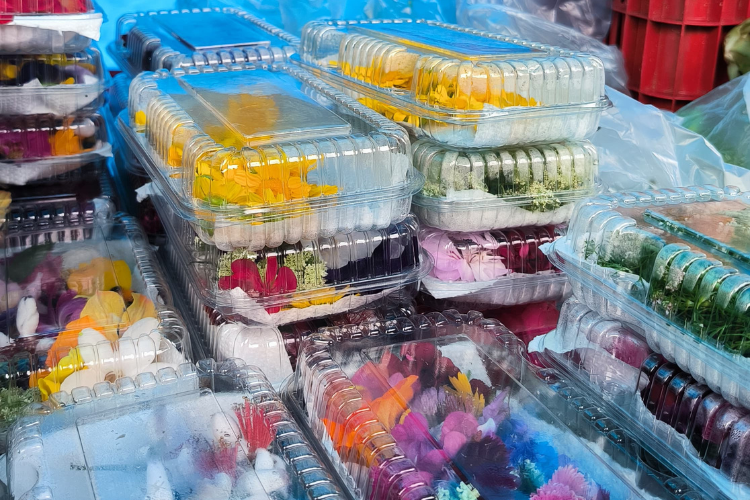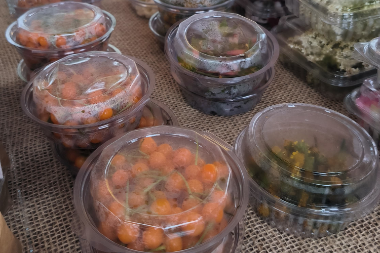 Durante a atividade, o grupo visitou duas bancas de destaque no trabalho com PANC. A primeira parada foi na banca da família Bellé, de Antônio Prado, integrante da Feira dos Agricultores Ecologistas e referência na oferta de flores comestíveis, comercializadas tanto in natura quanto desidratadas, além de hortaliças folhosas e sucos de frutas nativas.