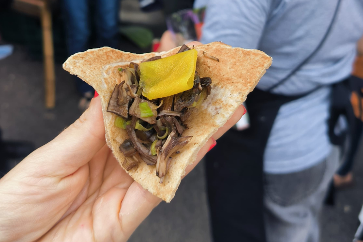 Em seguida, o grupo visitou a banca do Sítio Capororoca, pertencente à Feira Ecológica do Bom Fim e composta por mulheres da região metropolitana de Porto Alegre que participaram da construção do próprio conceito de PANC, ao lado do pesquisador Valdely Knupp.